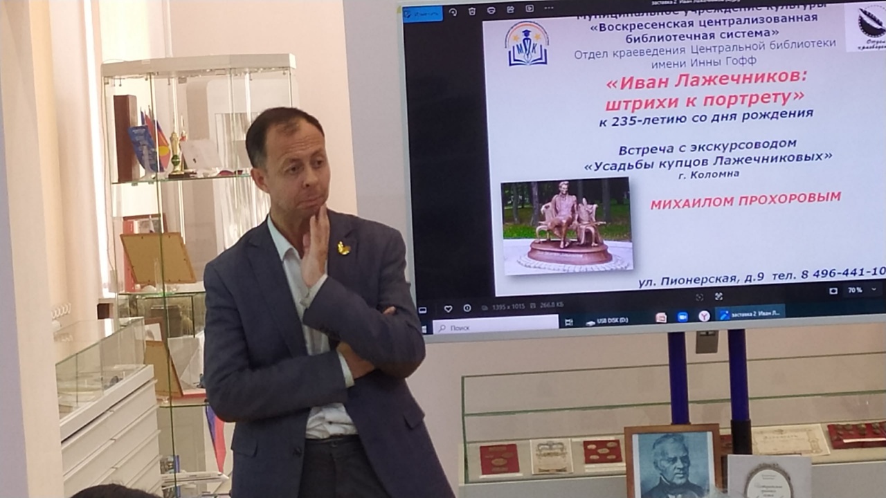 Гость из Коломны, экскурсовод «Усадьбы купцов Лажечниковых» Михаил Прохоров поведал любителям литературы и истории о тесной связи коломенской и воскресенской земли, интересных деталях жизни Ивана Лажечникова, приведённых в повести «Беленькие, чёрненькие и серенькие» хроника уездного городка».