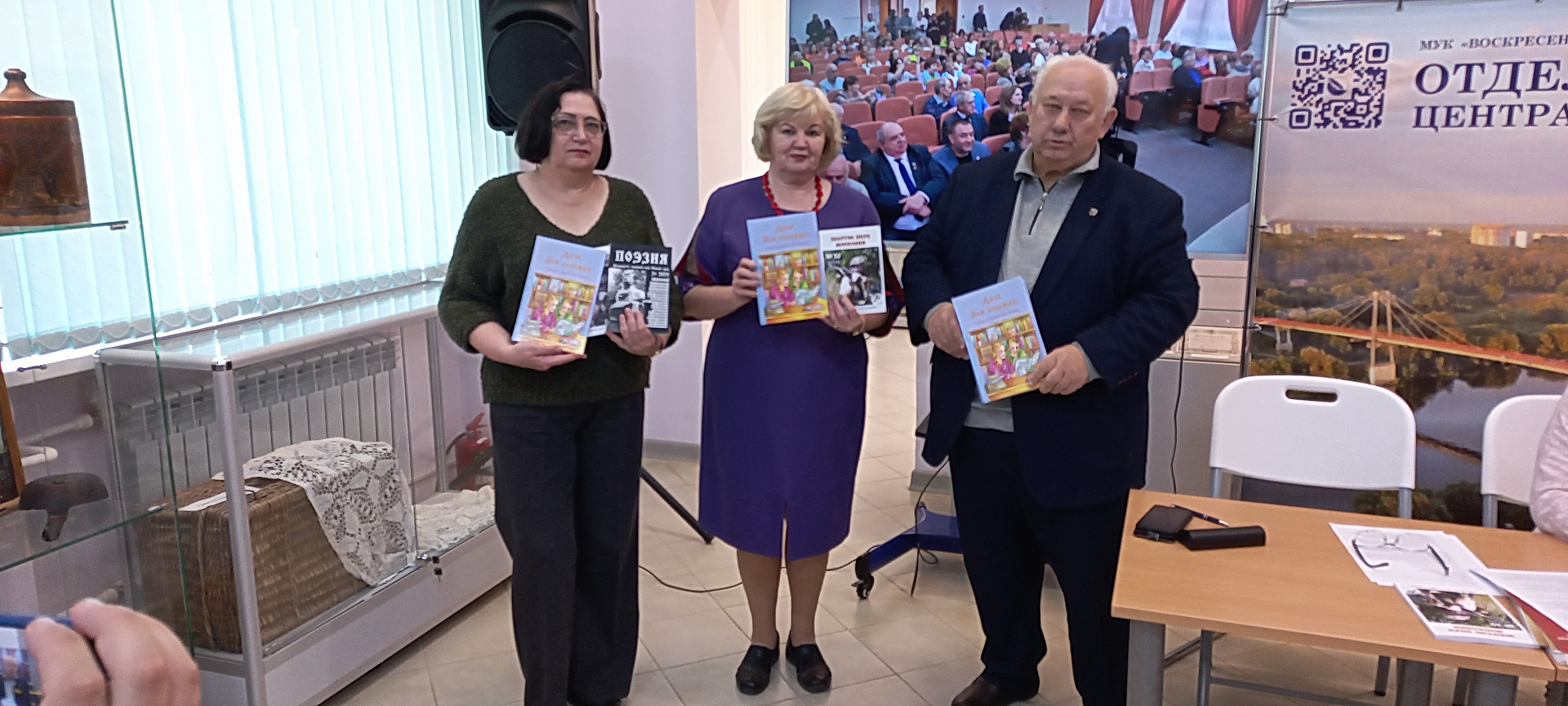 В ходе встречи литераторы познакомились с новыми изданиями, в которые вошли публикации воскресенских авторов. Сборники были подарены отделу обслуживания читателей и отделу краеведения Центральной библиотеки, а также Центральной детской библиотеке.