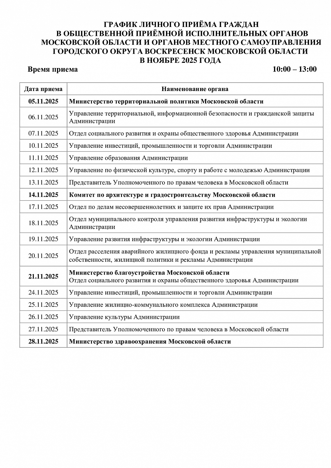 Администрация городского округа Воскресенск информирует о Графике личного приема граждан в общественной приемной исполнительных органов Московской области и органов местного самоуправления городского округа Воскресенск Московской области в ноябре 2025 года.