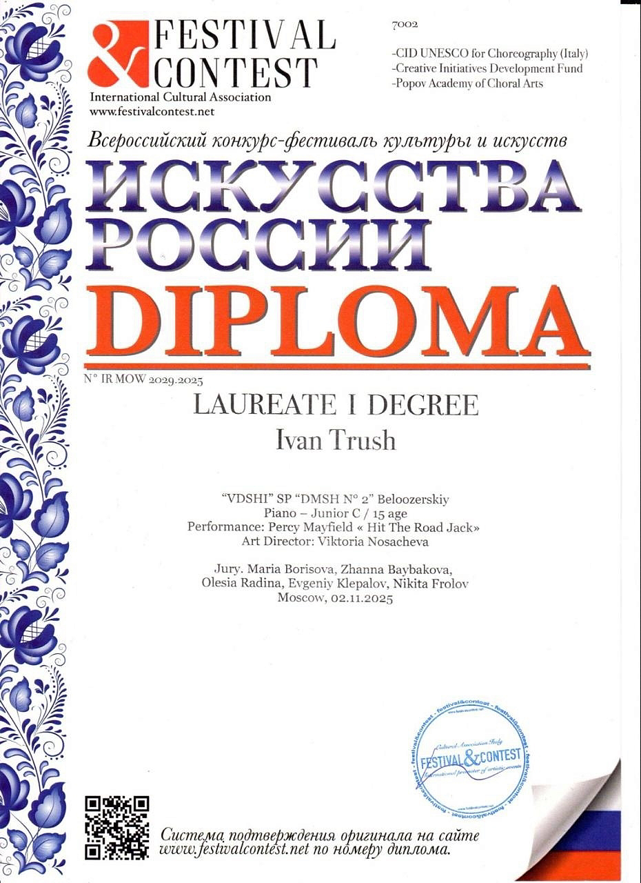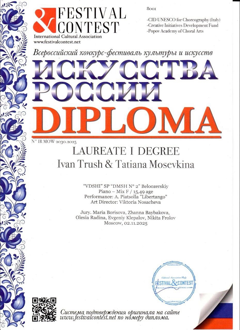 Пианисты ДМШ №2 Иван Труш и Татьяна Мосевкина в составе фортепианного дуэта под руководством Носачевой Виктории Васильевны стали Лауреатами I степени Многожанрового фестиваля-конкурса искусств “Искусства России”, который прошёл в Москве. Иван выступил также как отдельный участник (соло) и стал Лауреатом I степени.