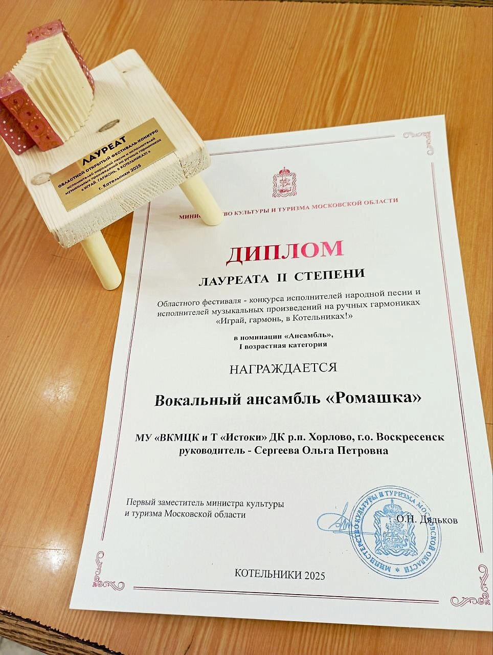 Вокальный ансамбль "Ромашка" (руководитель Сергеева Ольга Петровна) ДК р. п. Хорлово МУ "ВКМЦК и Т "Истоки" стал обладателем Диплома Лауреата II степени Областного фестиваля-конкурса исполнителей народной песни и исполнителей музыкальных произведений на ручных гармониках "Играй, гармонь, в Котельниках!"