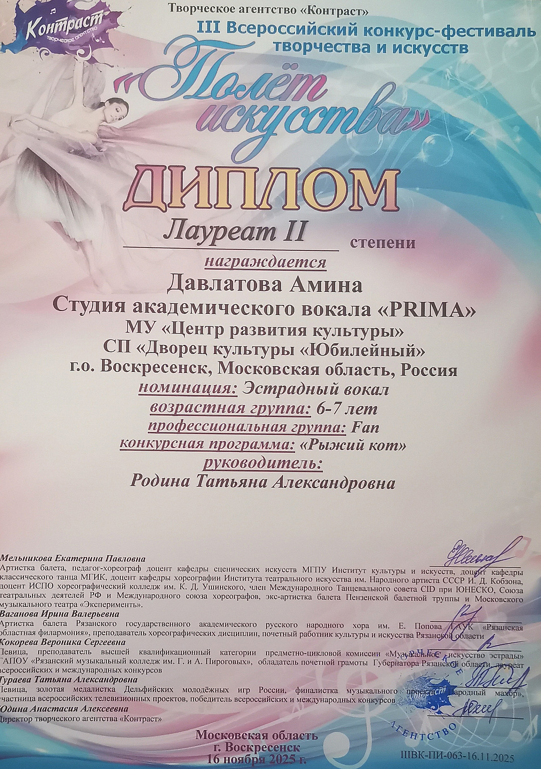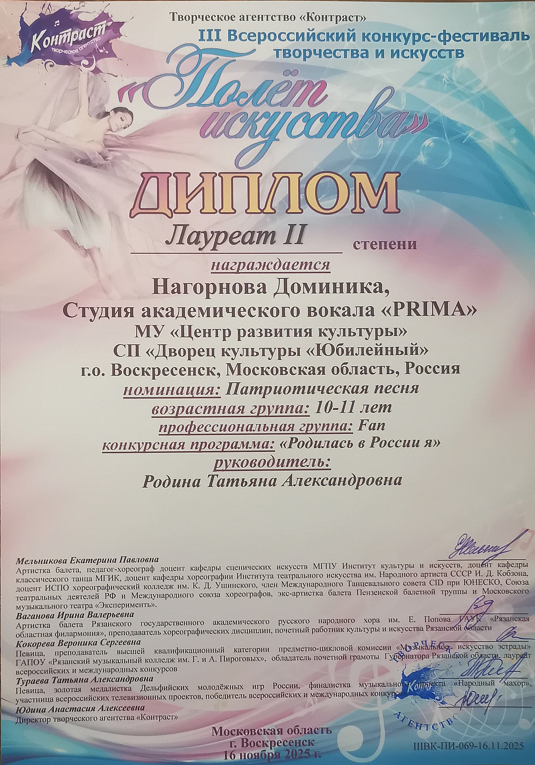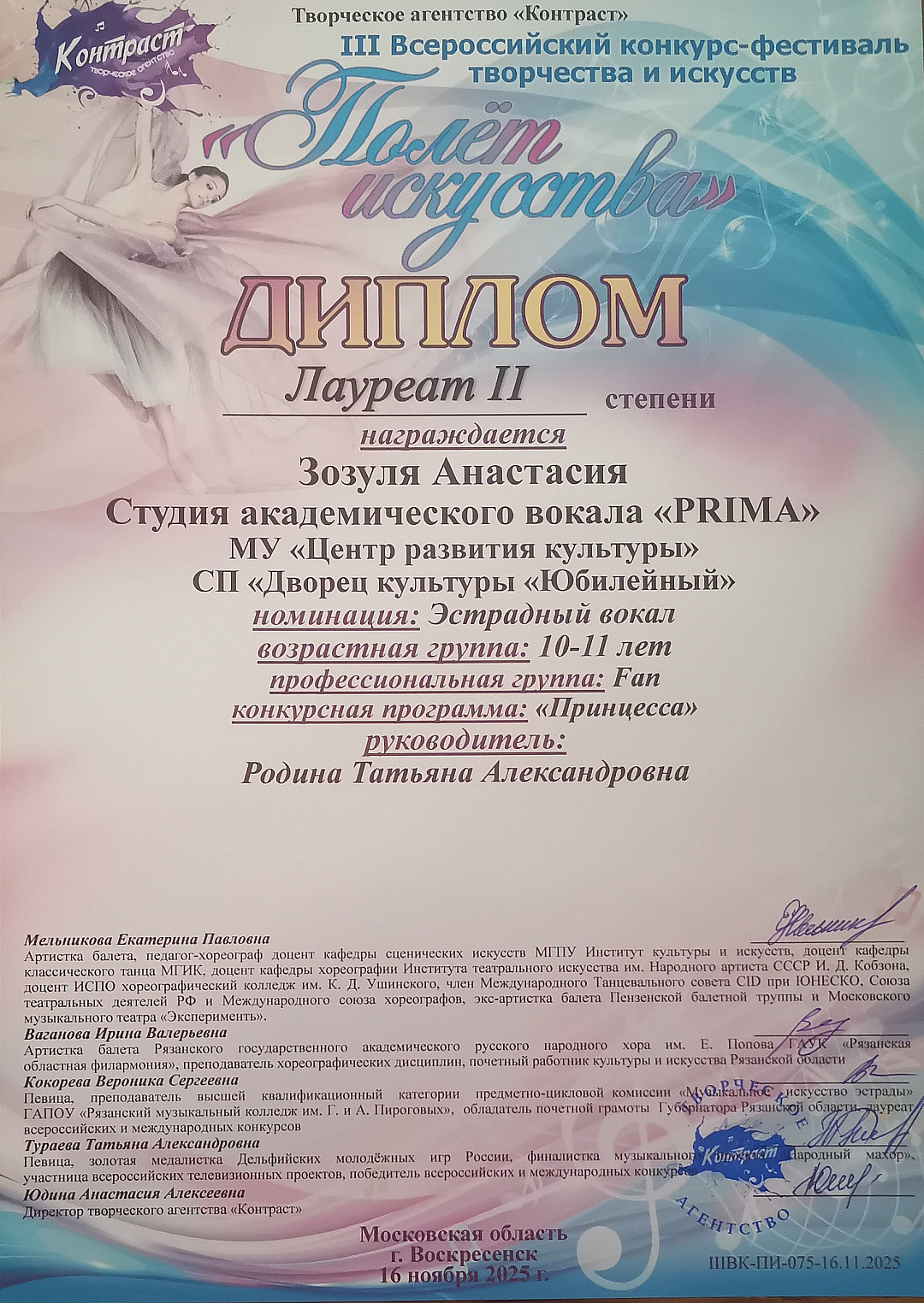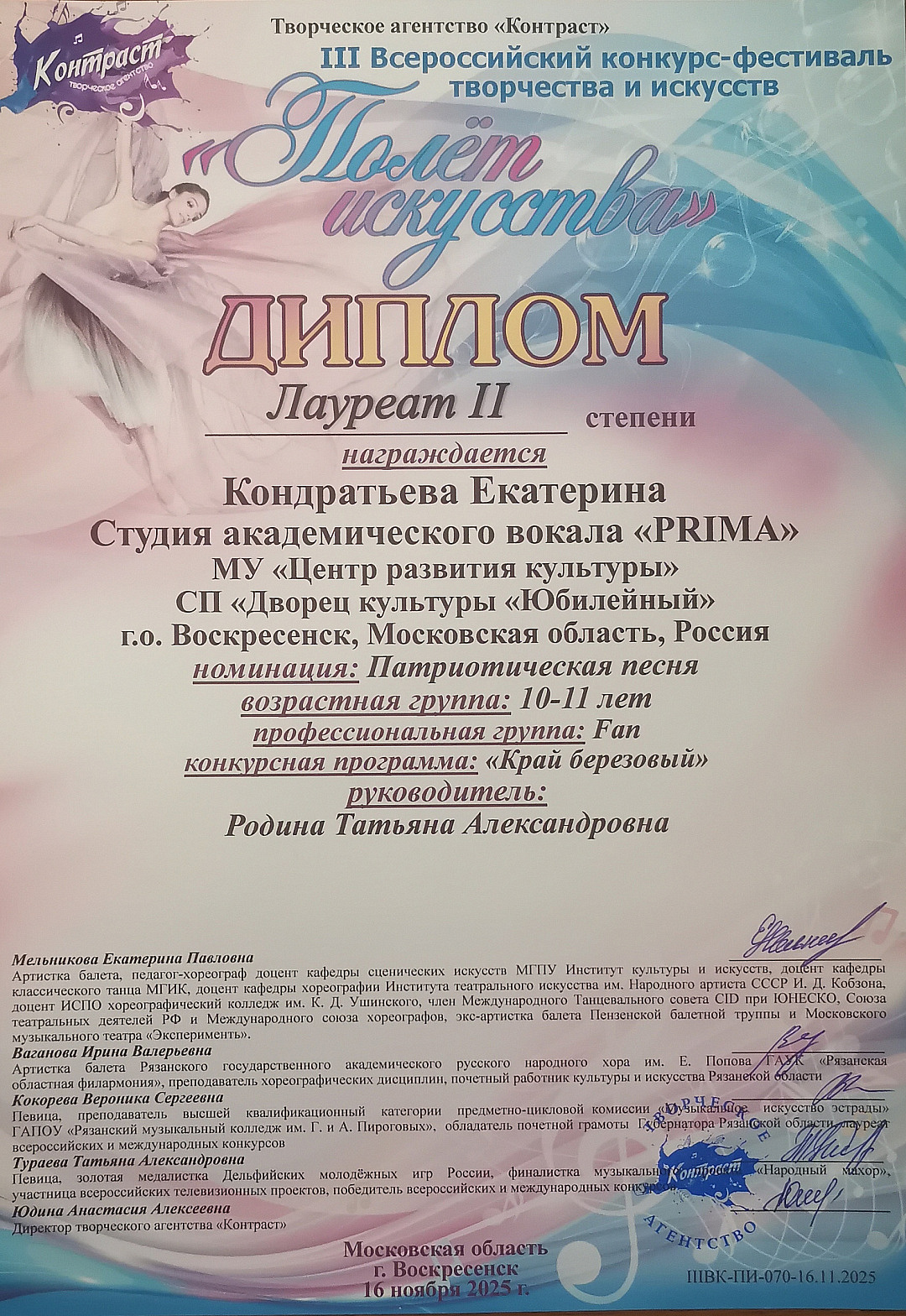 Солисты Студии академического вокала «PRIMA» (руководитель Татьяна Александровна Родина) завоевали много наград. Нагорнова Доминика, Кондратьева Екатерина, Маханько Василиса, Давлатова Амина, Зозуля Анастасия стали Лауреатами 2 степени.