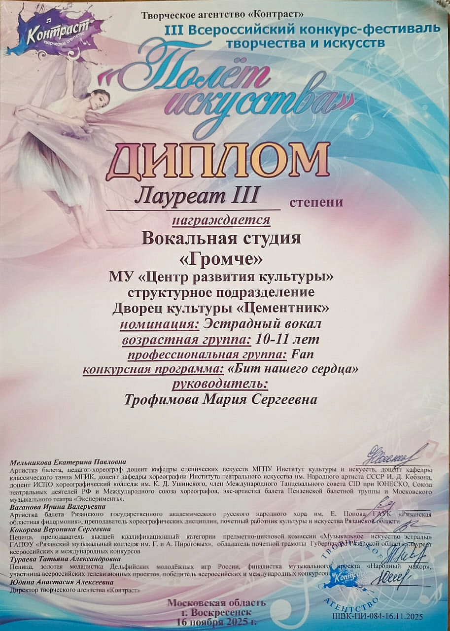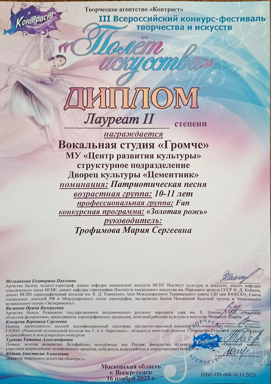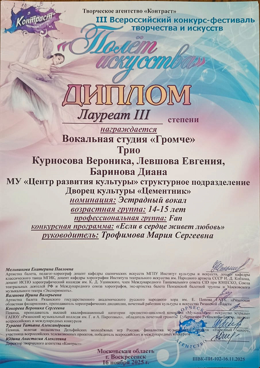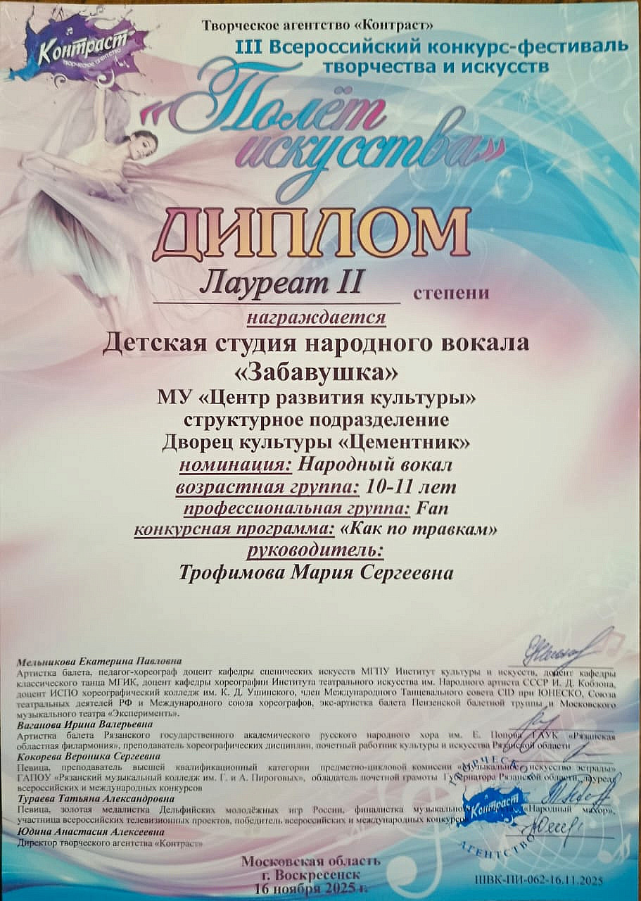 Коллективы ДК «Цементник» руководителя Марии Сергеевны Трофимовой замечательно выступили. Детская студия народного вокала «Забавушка» стала Лауреатом 2 степени, а вокальная студия «Громче» стала Лауреатом 2 и дважды – 3 степени.