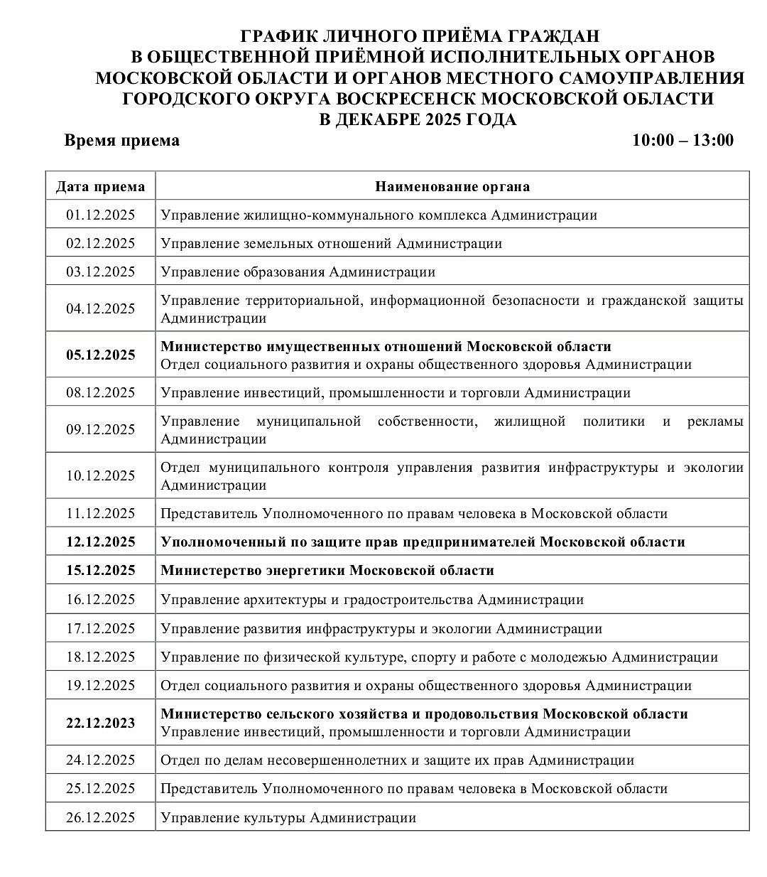 Администрация городского округа Воскресенск информирует о Графике личного приема граждан в общественной приемной исполнительных органов Московской области и органов местного самоуправления городского округа Воскресенск Московской области в декабре 2025 года.