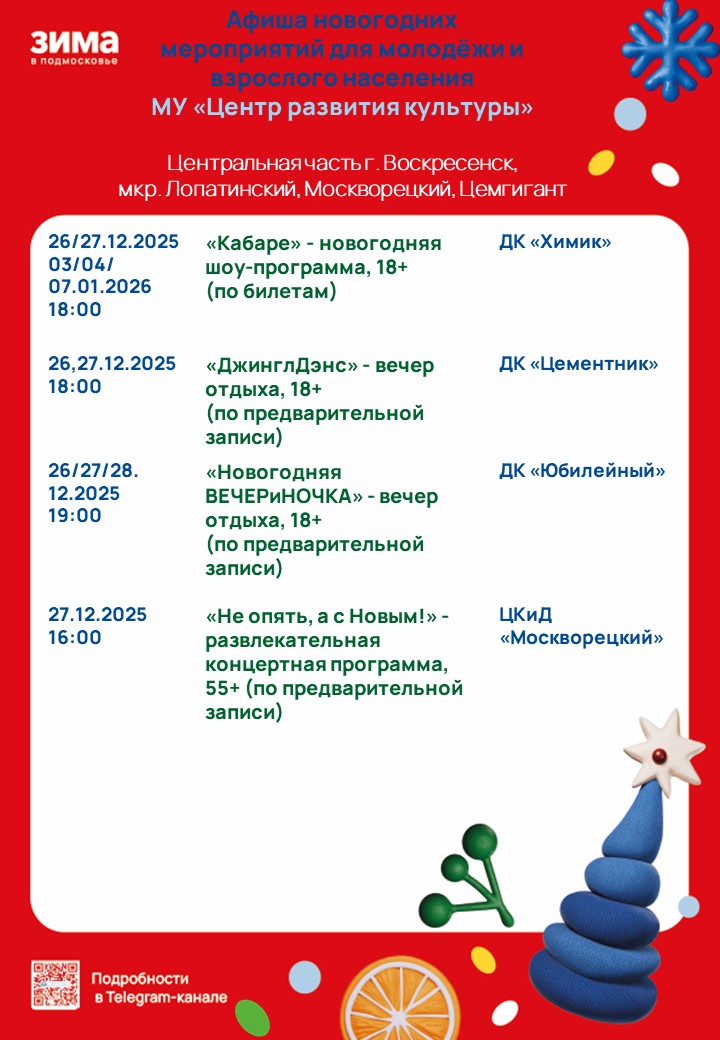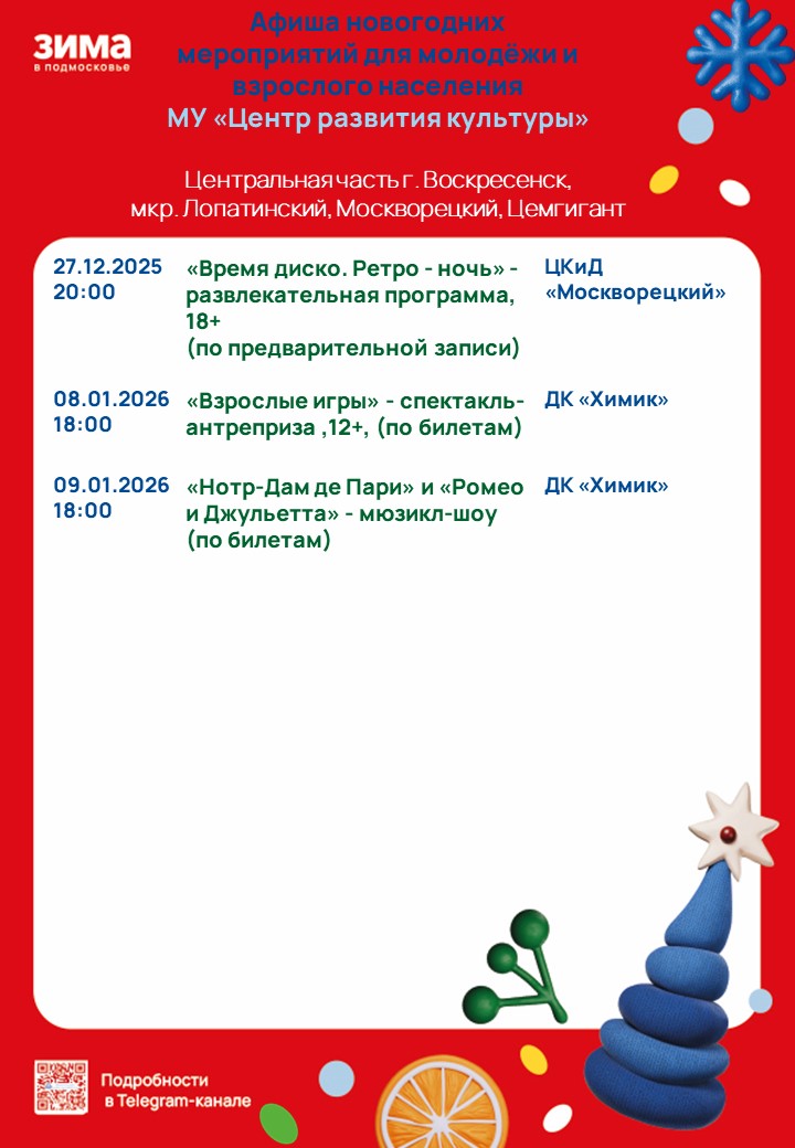 Учреждения культуры городского округа Воскресенск предусмотрели все пожелания и подготовили насыщенную программу новогодних мероприятий для молодёжи и взрослого населения.