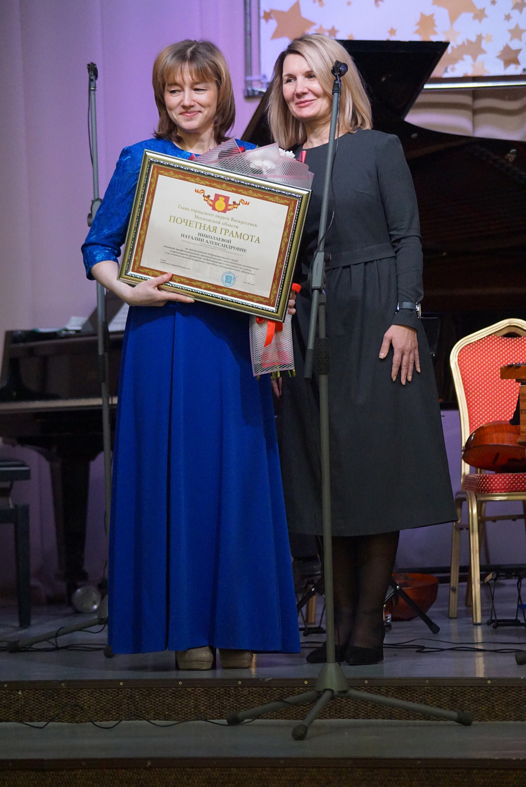 Начальник Управления культуры Администрации городского округа Воскресенск Елена Баклушина и депутат Совета депутатов Дмитрий Муконин поздравили коллектив с юбилеем и вручили заслуженные награды его участникам.