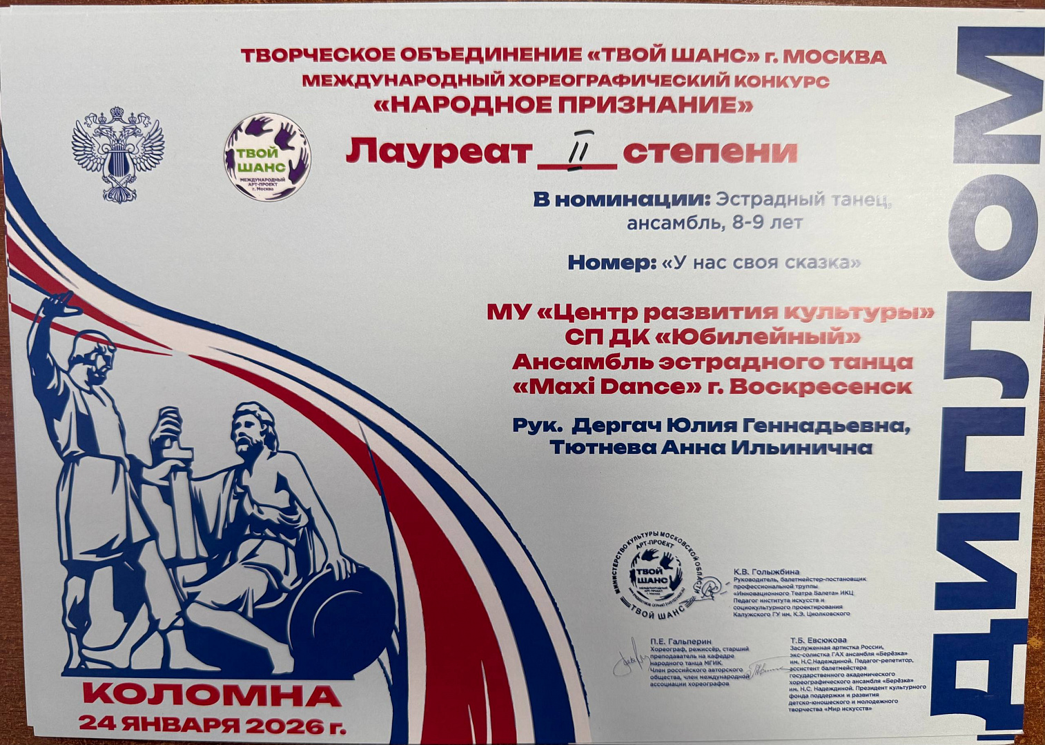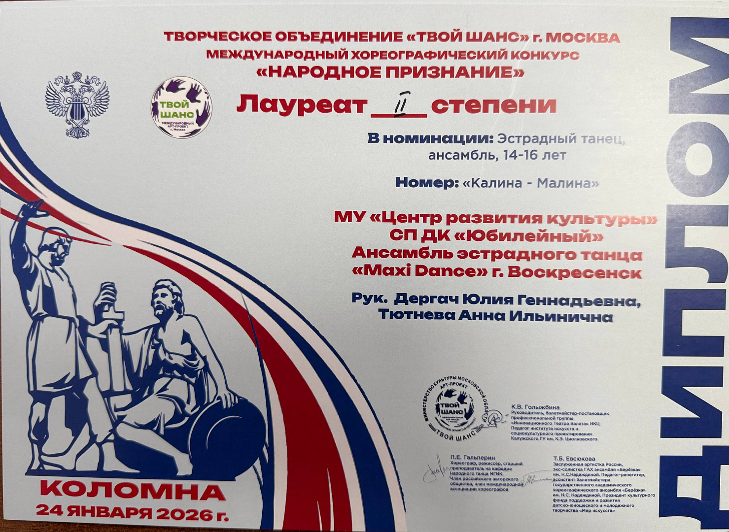 Ансамбль эстрадного танца «Maxi Dance» ДК «Юбилейный» МУ «Центр развития культуры» завоевал награды Международного хореографического конкурса «Молодость», который прошёл в Коломне.