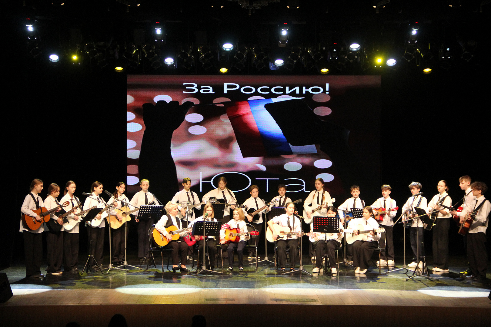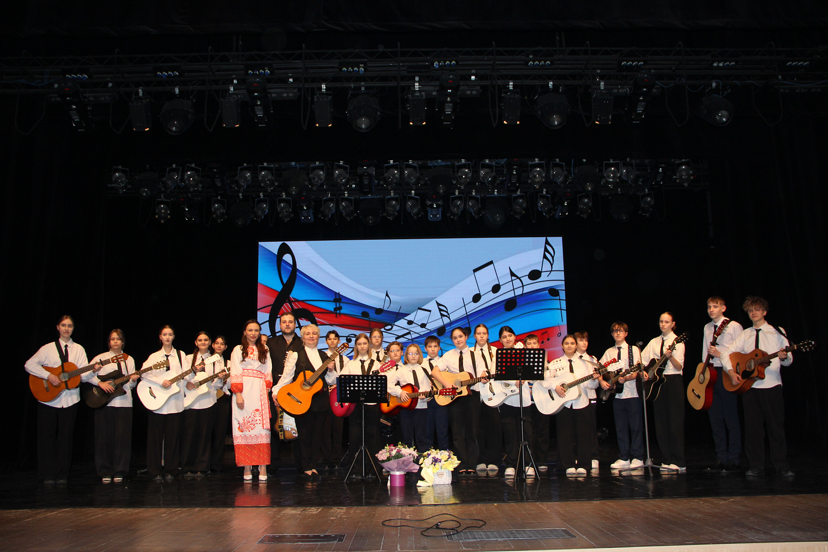 На сцене Дворца культуры выступили юные гитаристы студии игры на гитаре «Музыкальная лаборатория» под руководством Белобородовой Оксаны Владимировны. Их игра, наполненная страстью и мастерством, заставляла сердца биться в унисон с ритмом Родины.