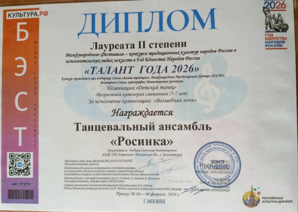 Танцевальный ансамбль «Росинка» ДК «Гармония» (руководитель Светлана Рыбина) стал лауреатом 2 степени Международного фестиваля - конкурса традиционных культур народов России в исполнительных видах искусств в Год Единства Народов России «Талант года 2026».