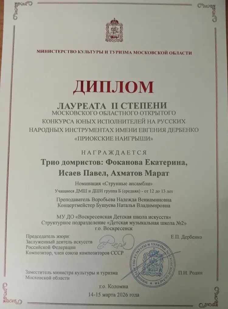 Трио воскресенских домристов в составе Фокановой Екатерины, Исаева Павла, Ахматова Марата (преподаватель Воробьева Надежда Вениаминовна, концертмейстер Бушуева Наталья Владимировна) показали высокий уровень исполнительского мастерства и стали Лауреатами II степени.