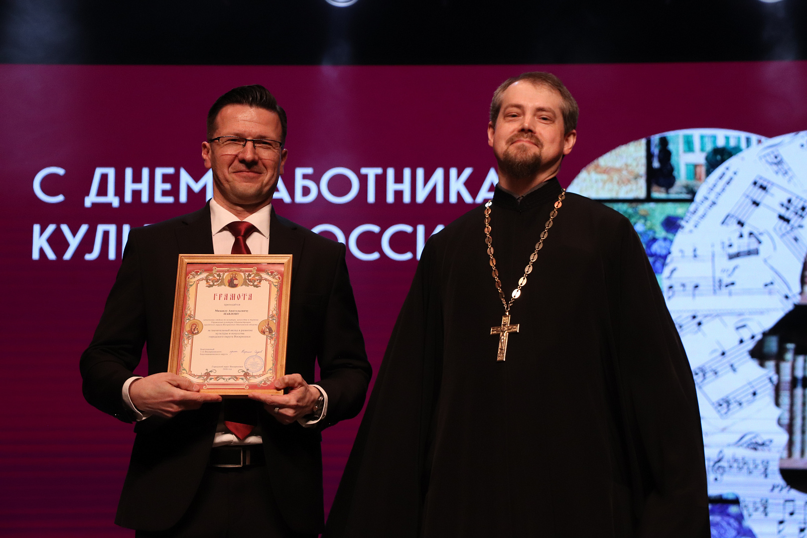 Благочинный 1-го Воскресенского церковного округа, протоиерей Кирилл Седов поздравил культурное сообщество с праздником и преподал грамоты за продвижение культурного наследия и сохранение исторических традиций Воскресенского края.