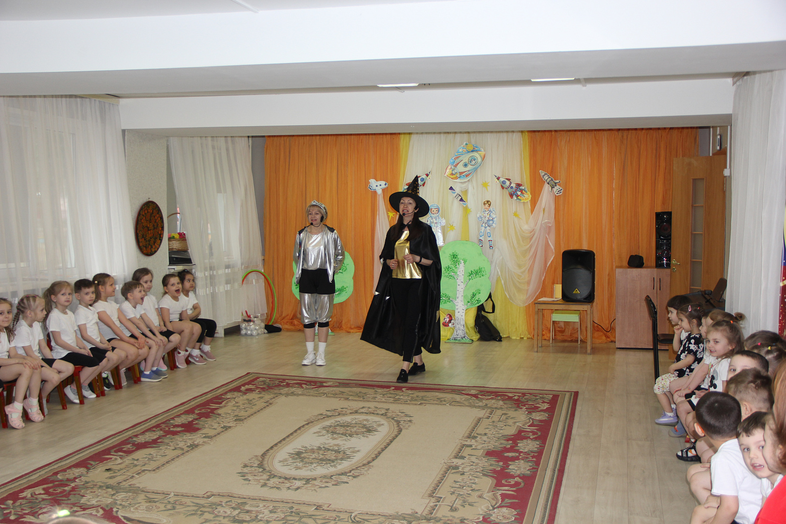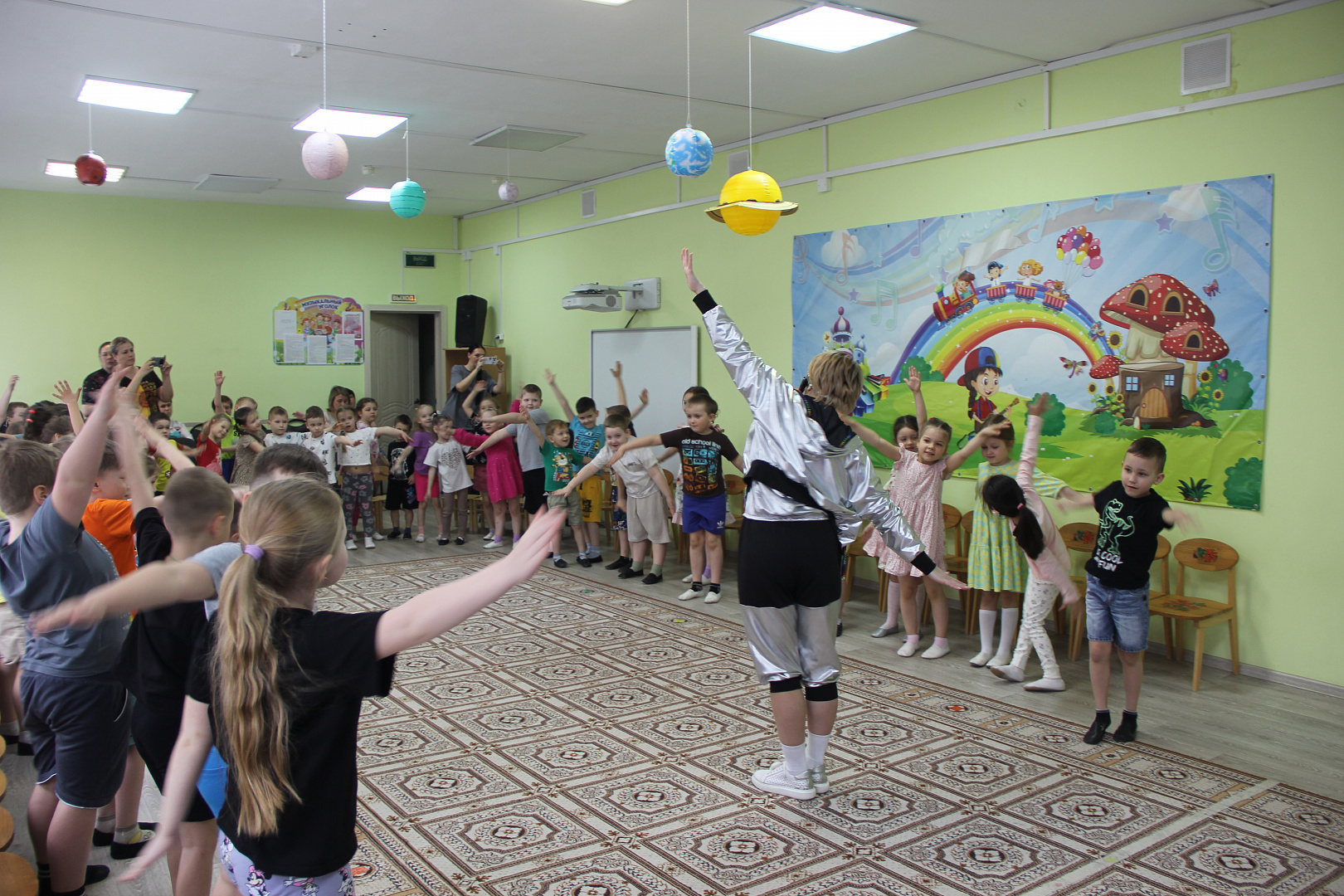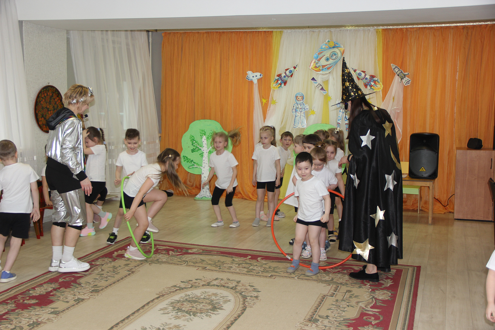 На празднике для дошкольников Звездочет и инструктор по космическим полетам организовали воображаемое космическое путешествие в сопровождении.