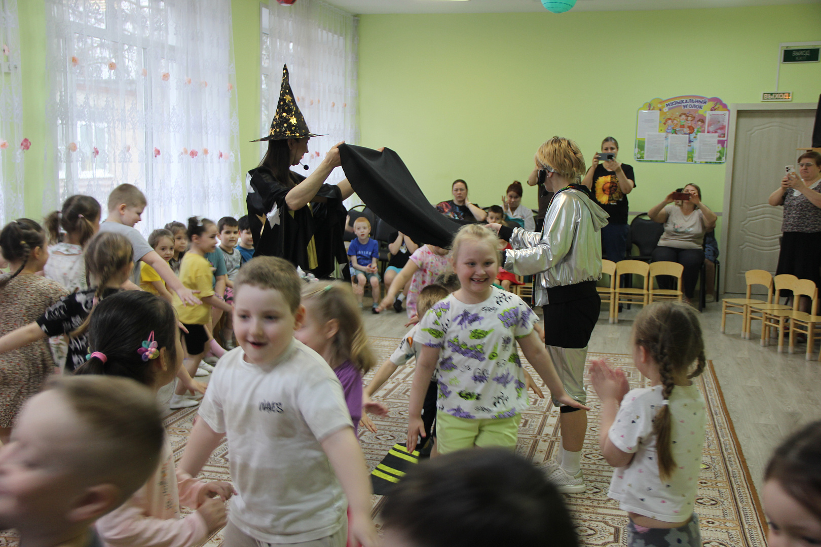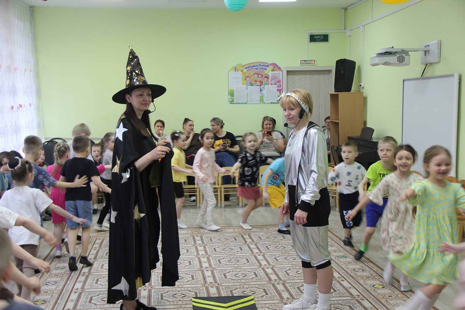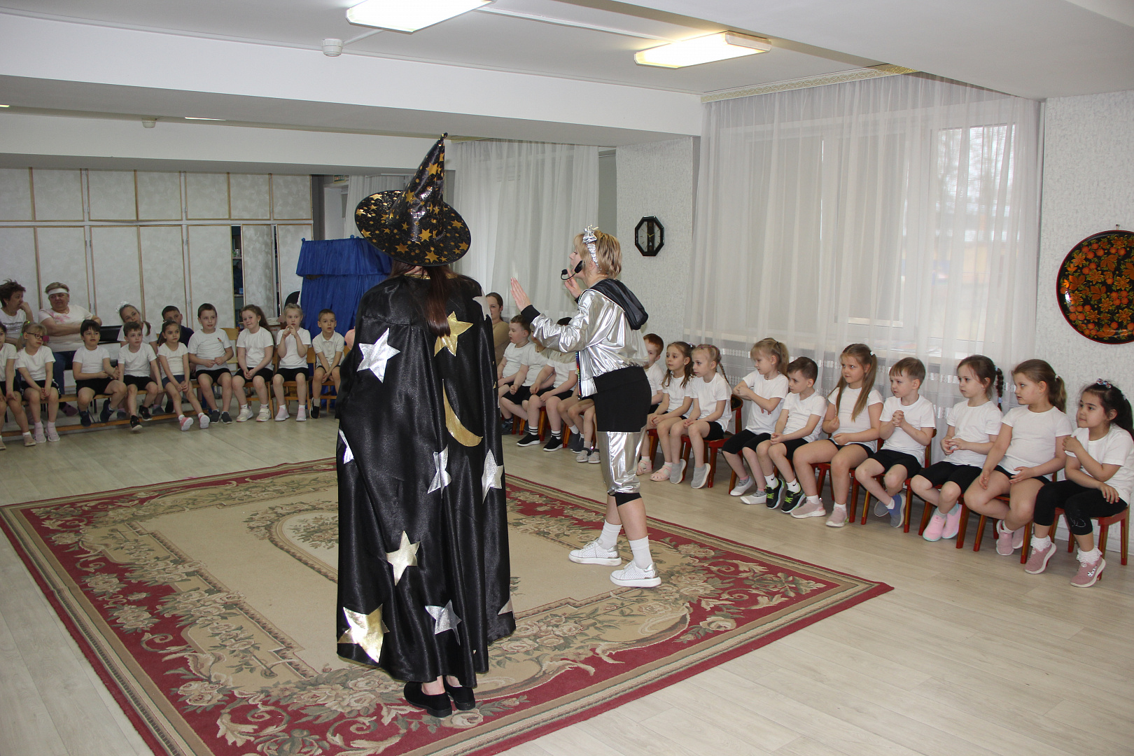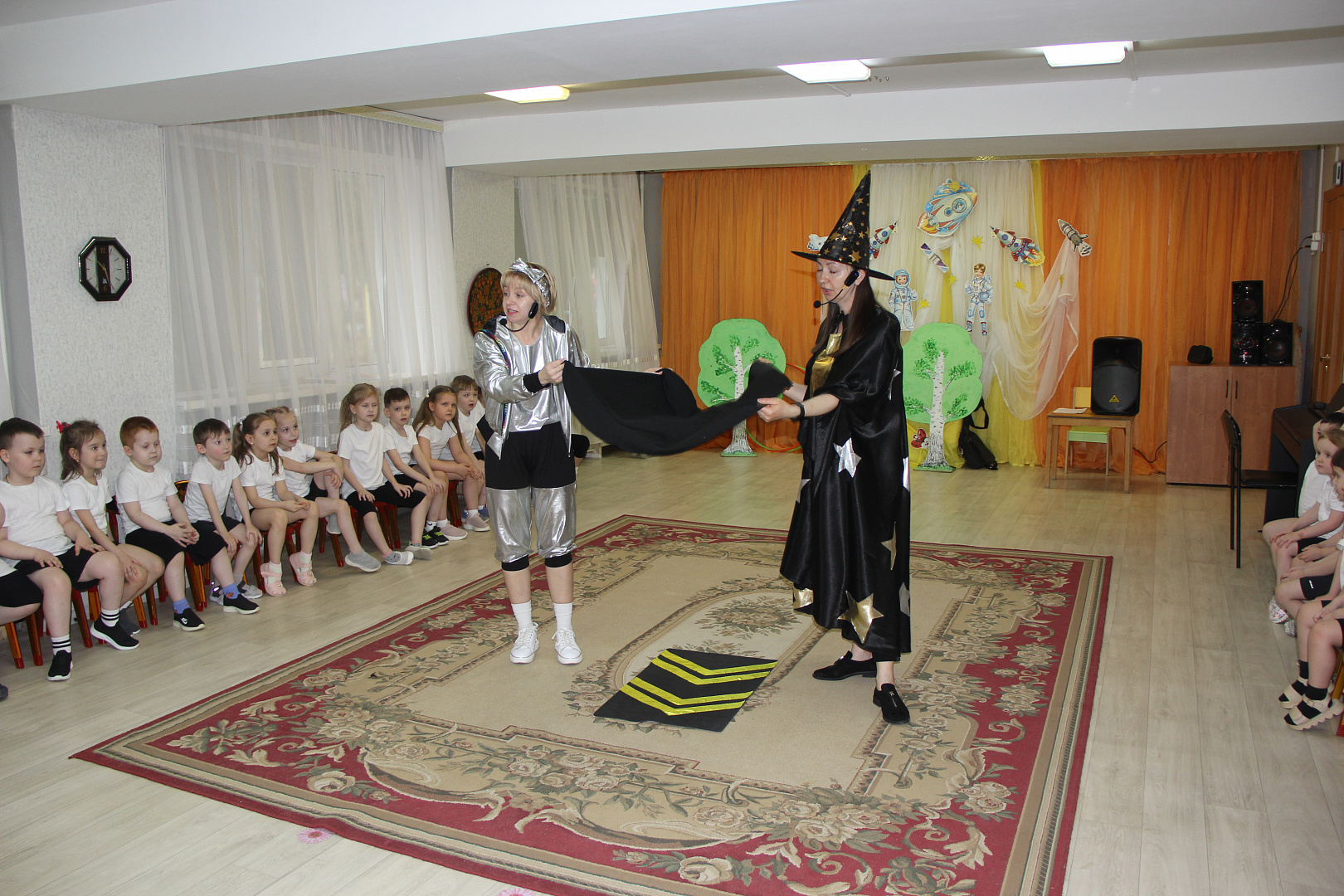 На празднике для дошкольников Звездочет и инструктор по космическим полетам организовали воображаемое космическое путешествие в сопровождении.