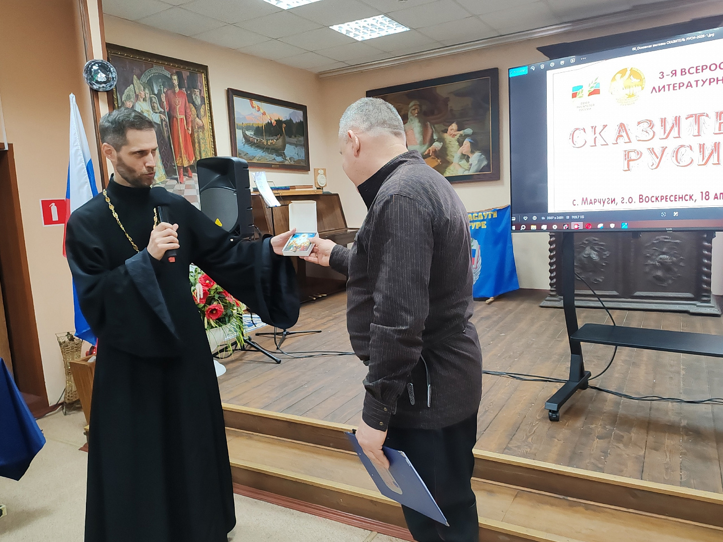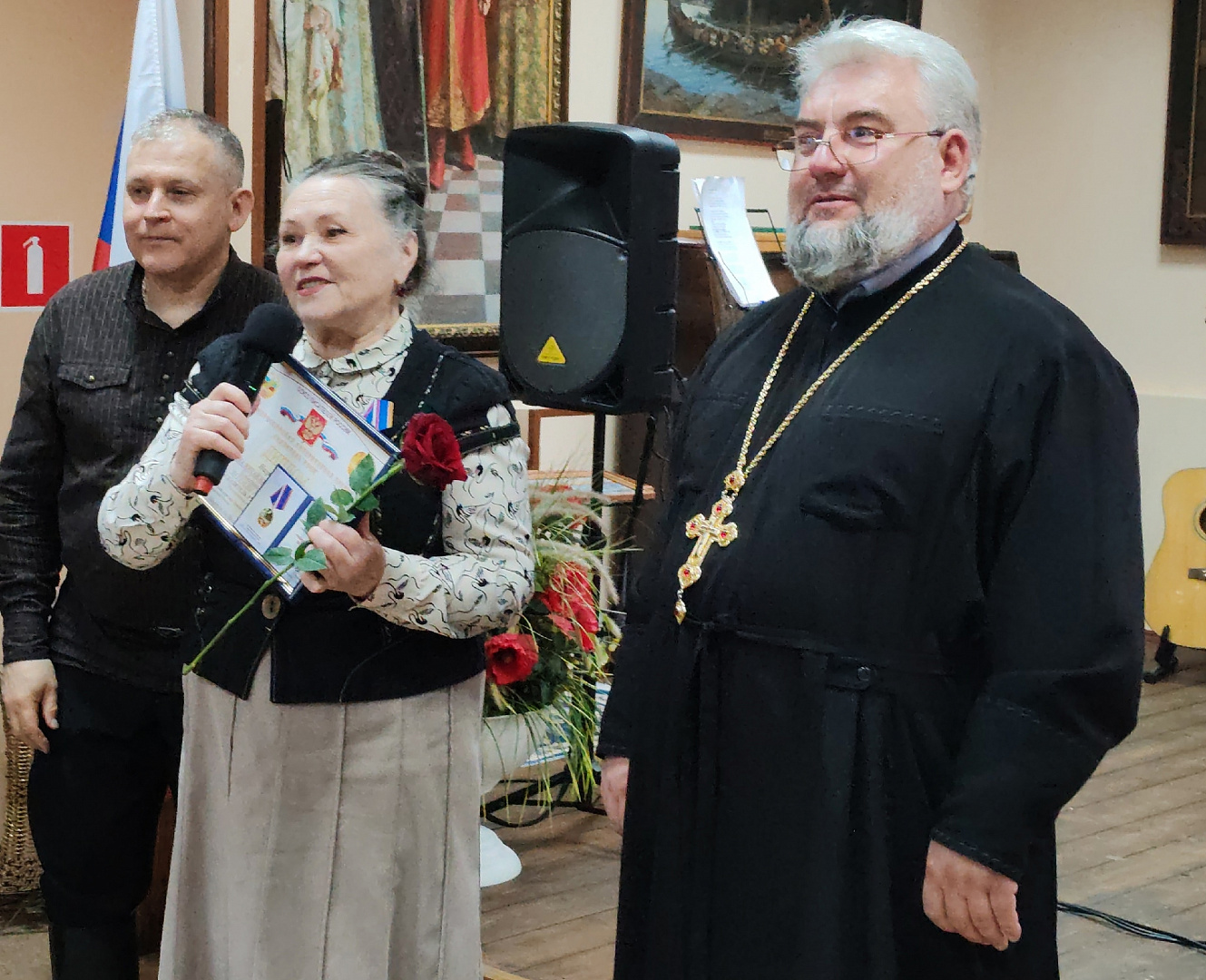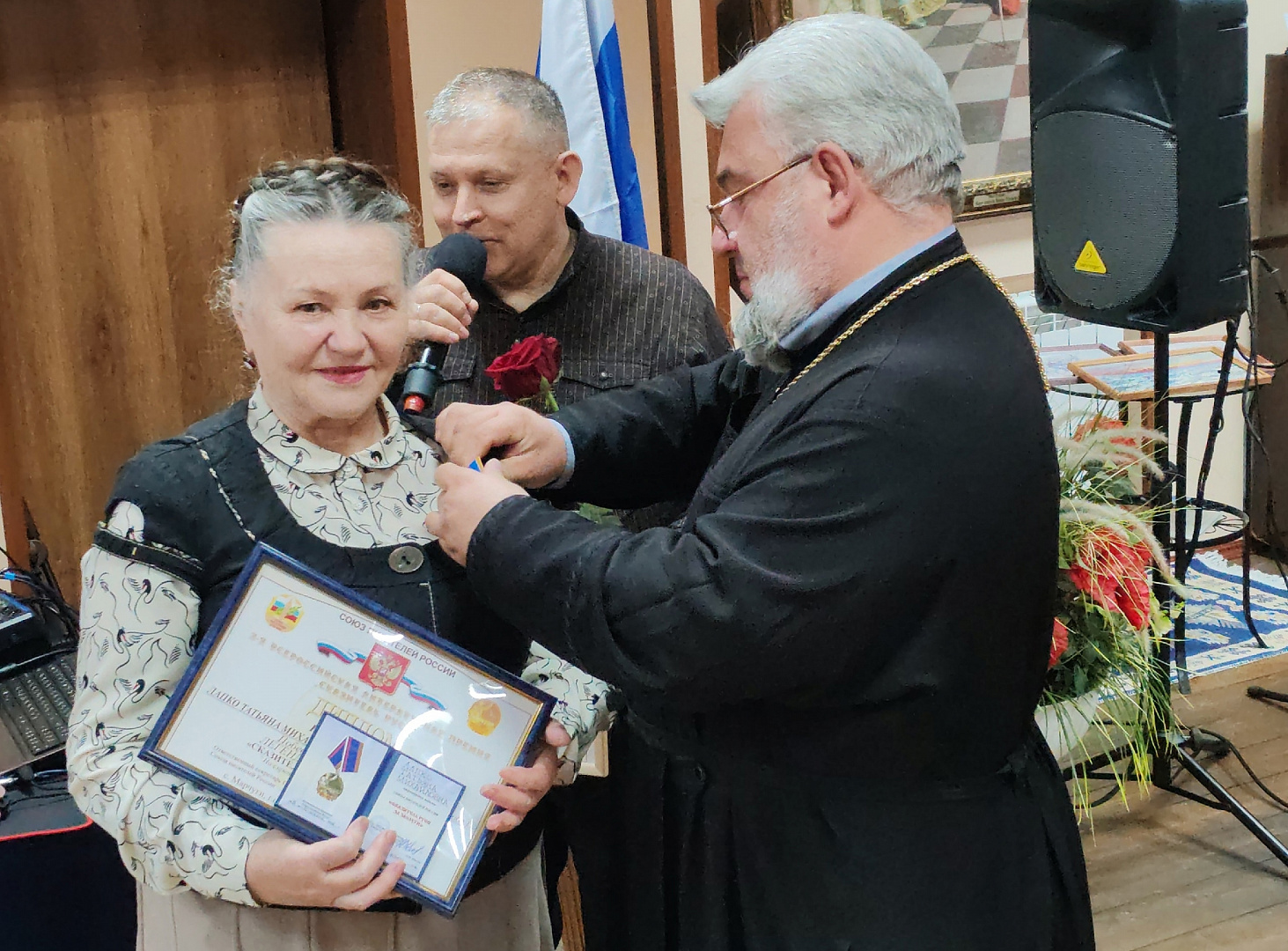 Благочинный 2-го Воскресенского благочиннического округа, протоиерей Сергий Рыбаков вручил медаль «Сказитель Руси - За заслуги» сказительнице из Великих Лук (Псковская область) - Татьяне Лапко за книгу «На сиреневой птице» (семейная сказка).