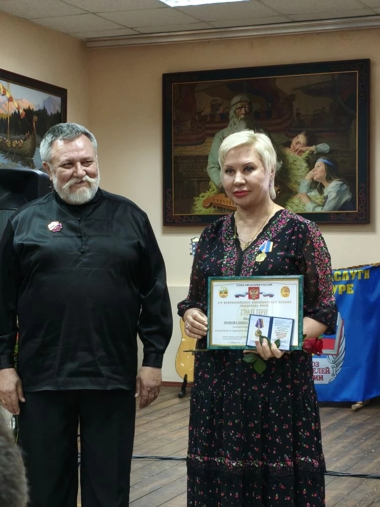 Заместитель ответственного секретаря Правления и председатель творческого Совета по прозе Союза писателей России Василий Дворцов вручил диплом лауреата Гран-при “За вклад в отечественную литературу, возрождение и сохранение духовных и исторических ценностей России”, медаль “Сказитель Руси - Национальная премия” (№18) и денежную премию поэтессе Нине Поповой (Москва).