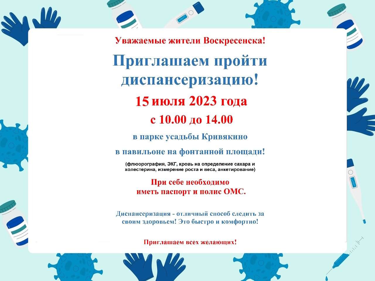 15 июля с 10.00 до 14.00 в парке усадьбы Кривякино в павильоне на фонтанной площади у каждого из вас есть возможность пройти диспансеризацию (флюорография, ЭКГ, кровь на определение сахара и холестерина, измерение роста и веса, анкетирование).