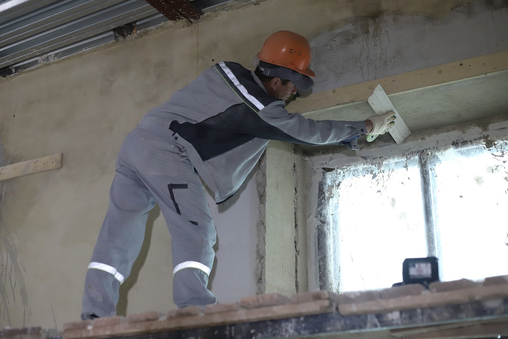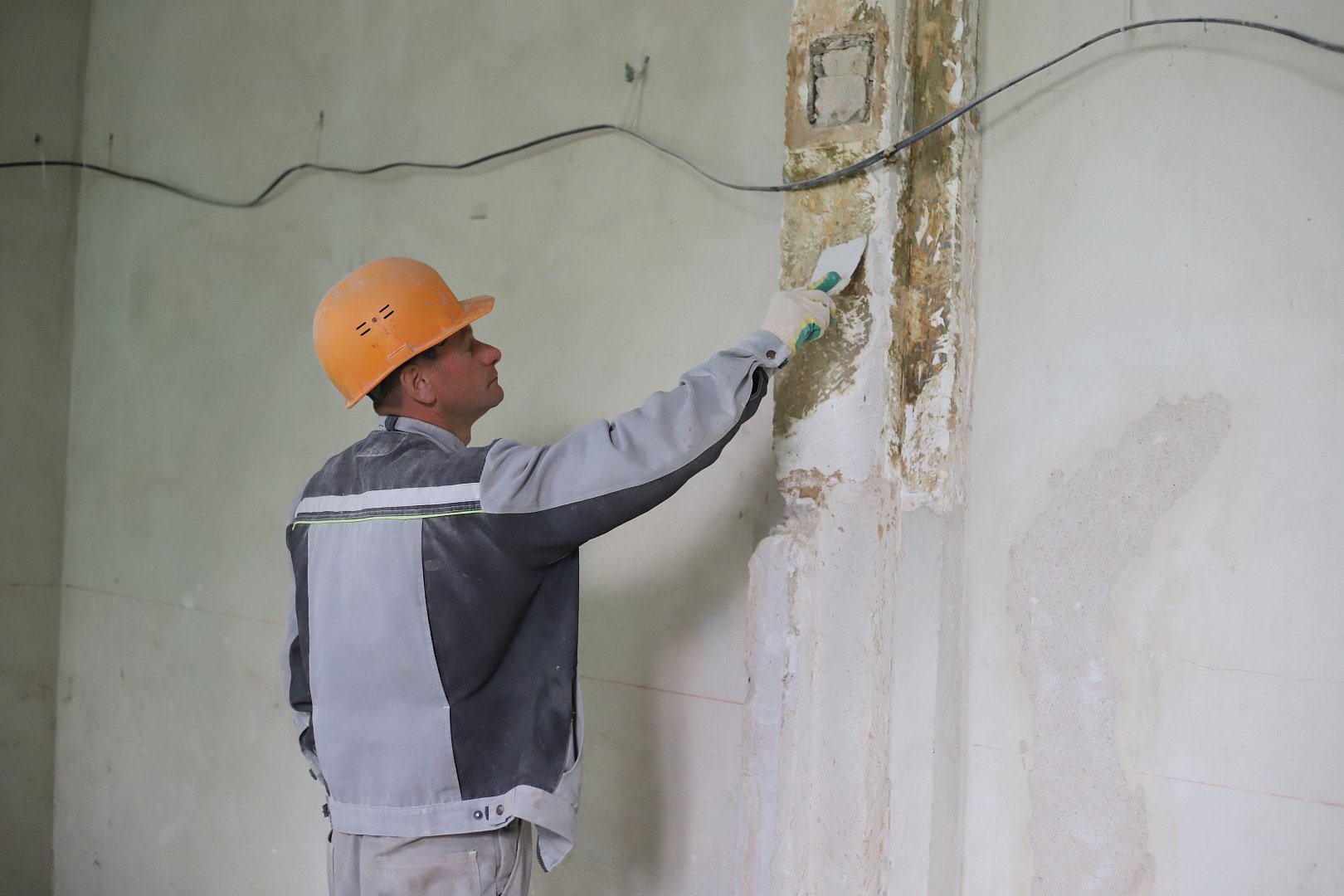 Работы по кладке и штукатурке оконных откосов, очистке от масляной краски архитектурных деталей, расчистке фасада, докомпановке белого камня, протезированию белого камня (карнизы и колонны) проводятся согласно графику.