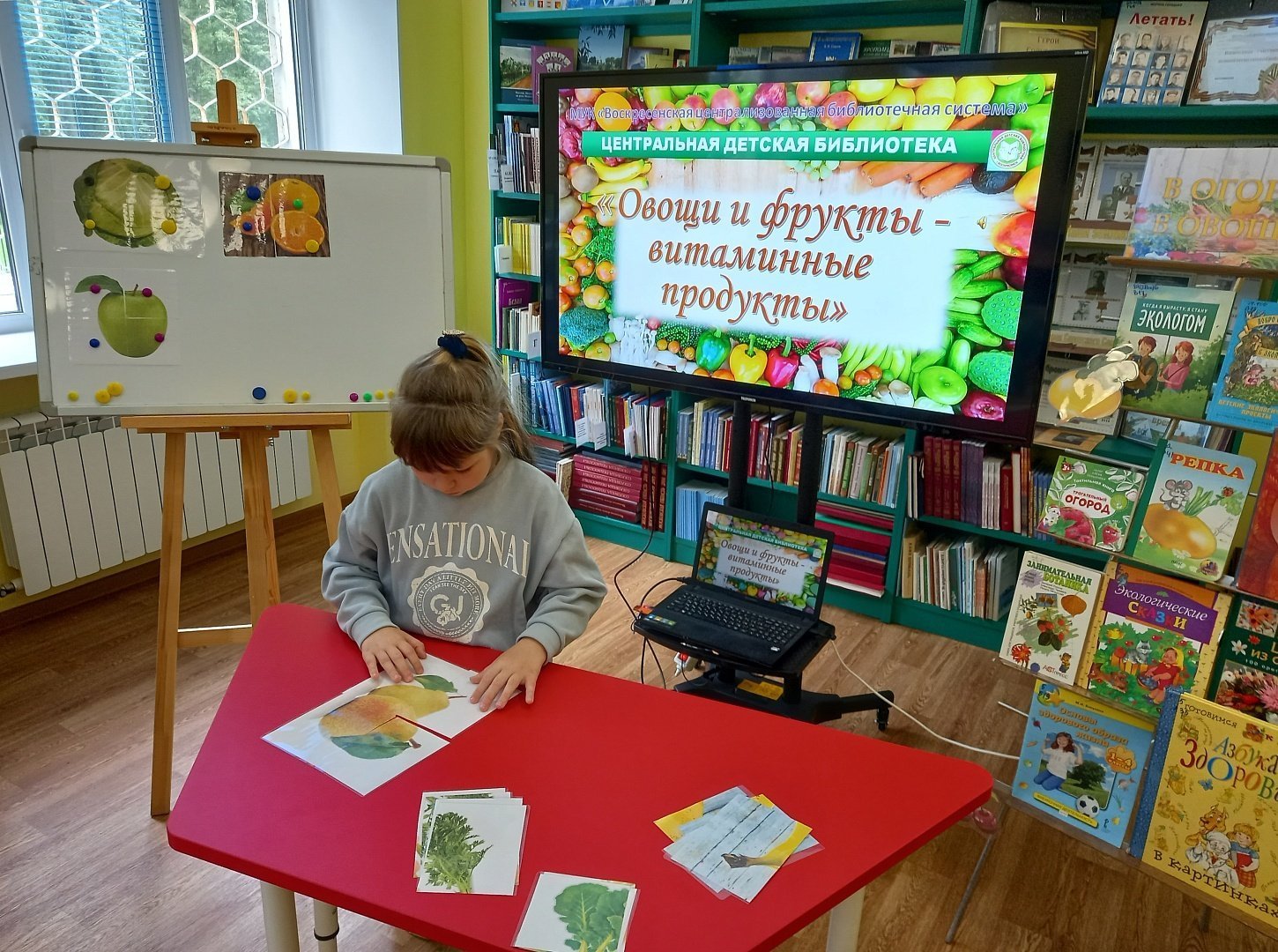 В Центральной детской библиотеке для детей из ГБУСОМО «Комплексный центр социального обслуживания и реабилитации «Воскресенский» была проведена игровая программа «Овощи и фрукты – витаминные продукты». Ребята приняли участие в конкурсах «Угадай-ка», «Урожай», «Собери пазл», отгадали фруктово-овощные загадки. Дети с удовольствие посмотрели мультфильм «Весёлый огород» по сказке Владимира Сутеева. Завершилось мероприятие мастер-классом «Яблочко с червячком».