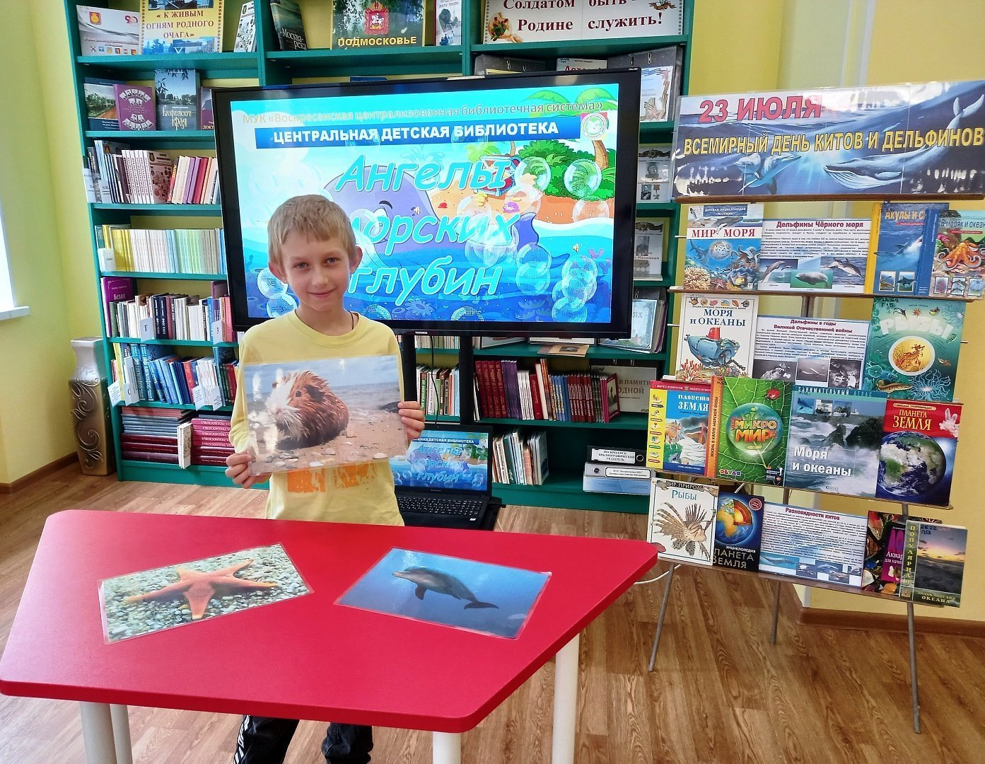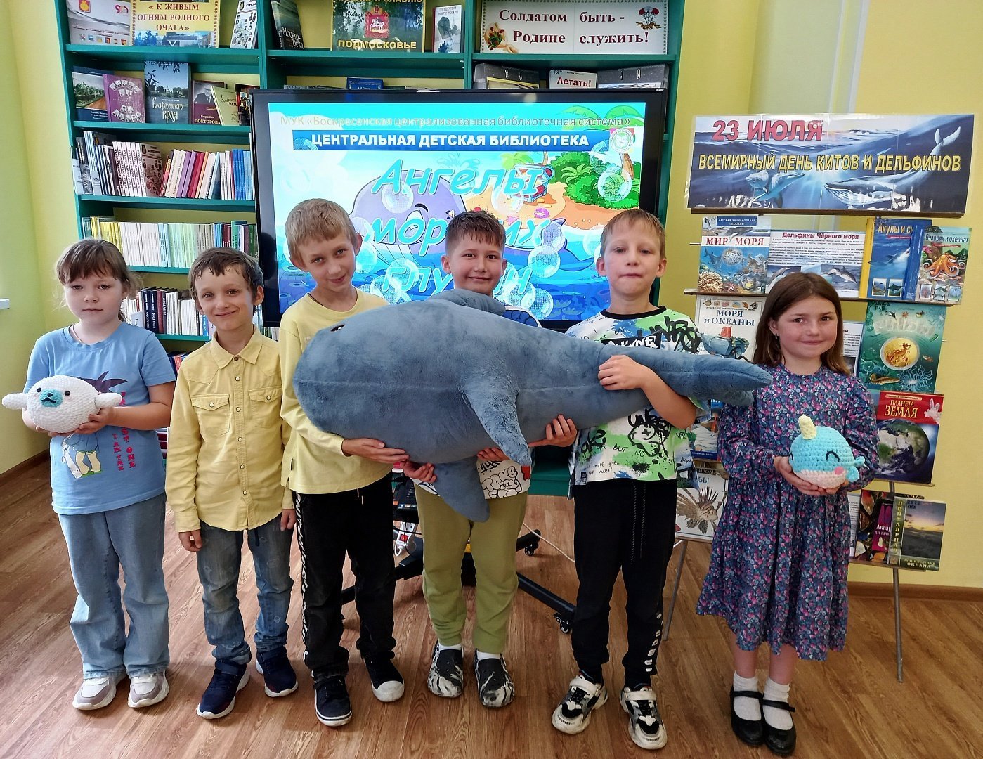 В Центральной детской библиотеке для воспитанников ГБУСОМО «Комплексный центр социального обслуживания и реабилитации «Воскресенский» в рамках библиотечного проекта «Вместе - ради детей» был проведен познавательный час «Путешествие с морскими великанами», посвященный Всемирному дню китов и дельфинов.