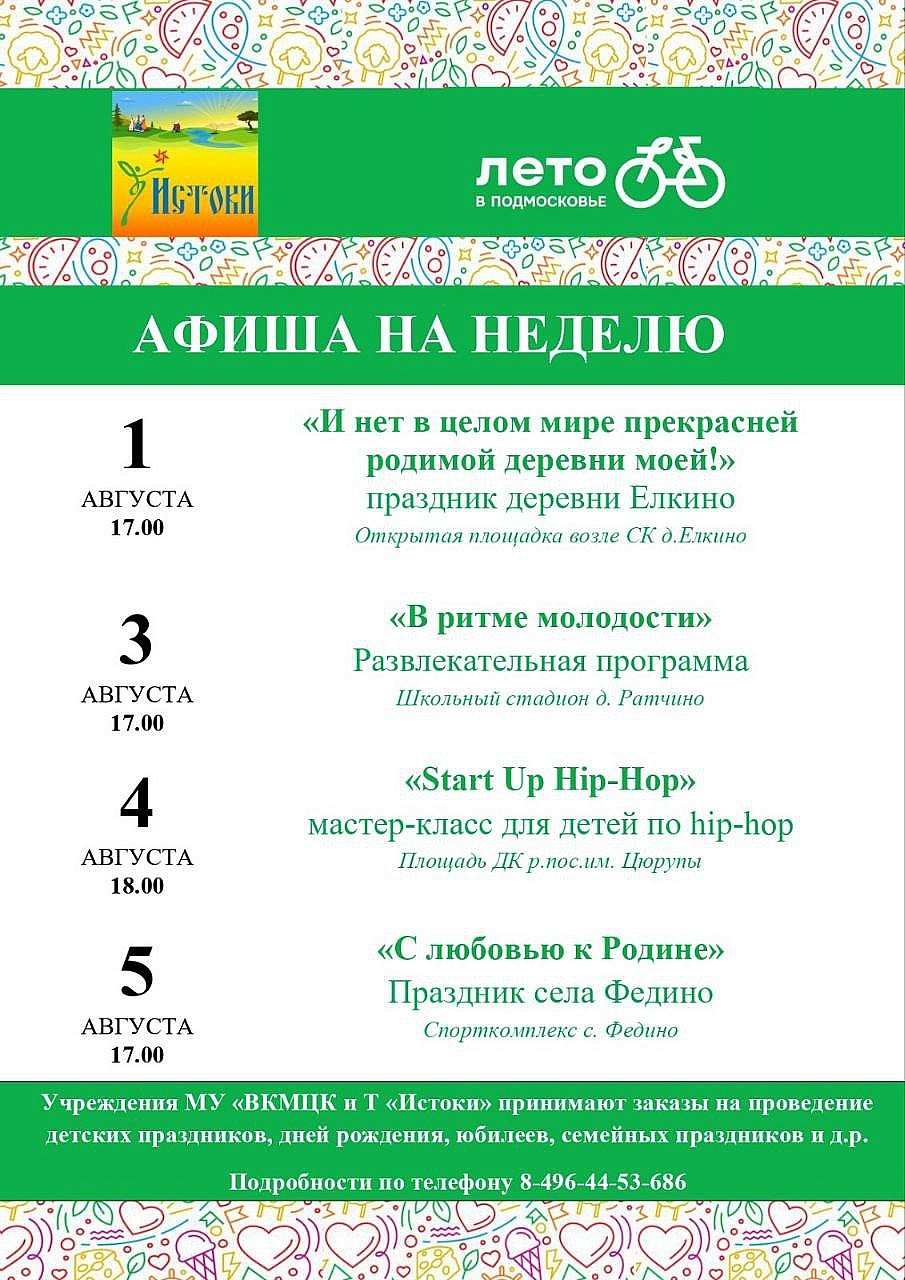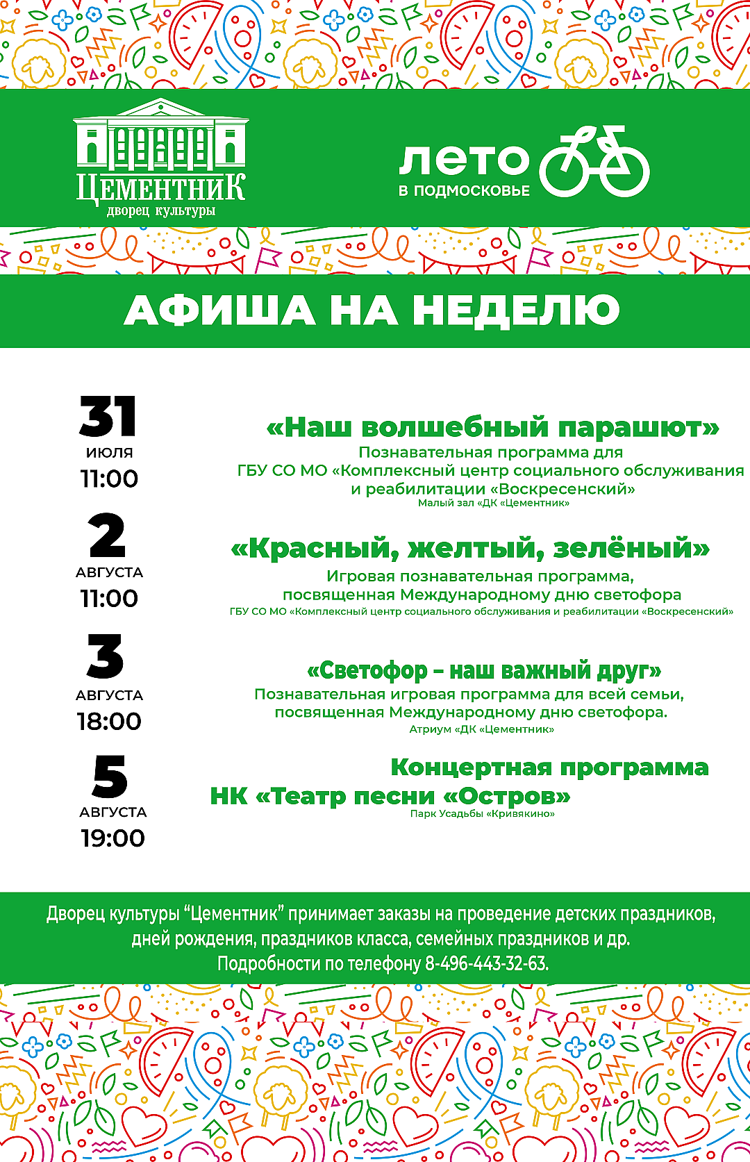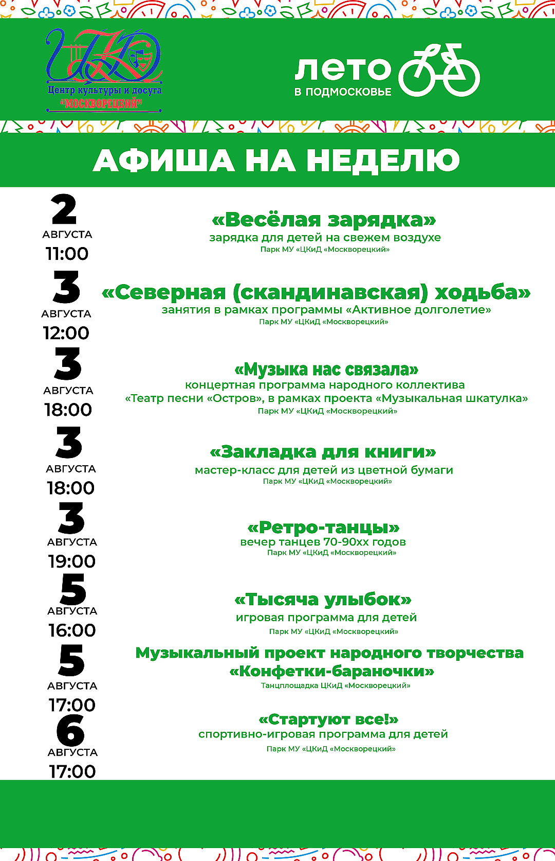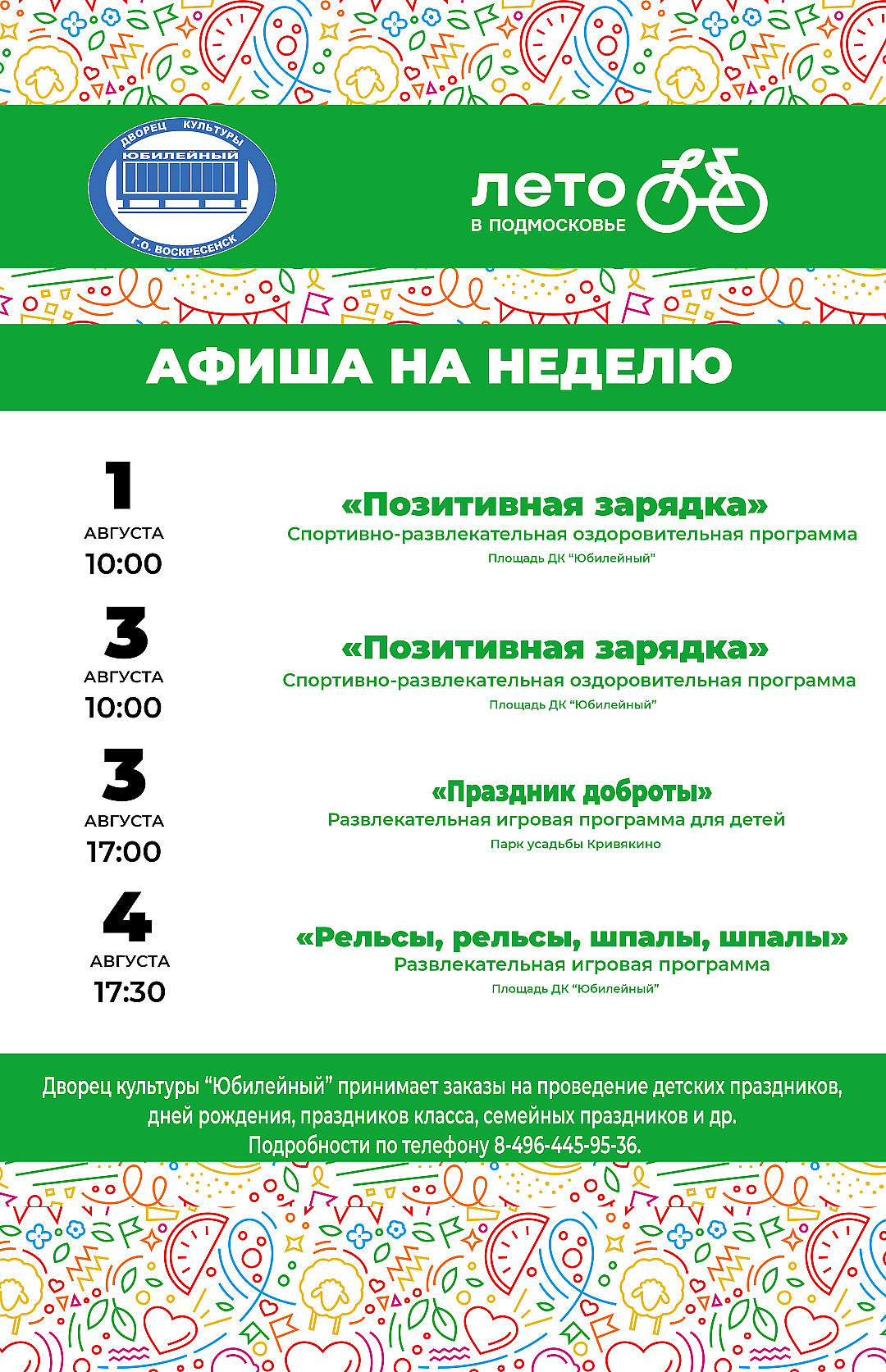 В городском округе Воскресенск проходит огромное количество мероприятий. Мы всегда рады видеть у себя в гостях жителей других городов. Предлагаем вашему вниманию афишу мероприятий на следующую неделю, чтобы вы могли спланировать свой досуг в Воскресенске.