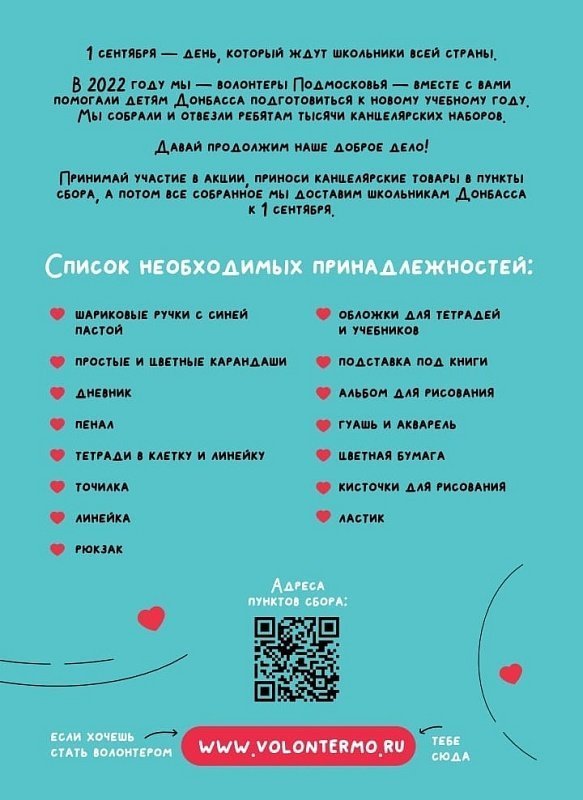 Все желающие могут принести книги и канцелярские товары в пункты сбора. Всё собранное будет доставлено школьникам Донбасса к 1 сентября.
