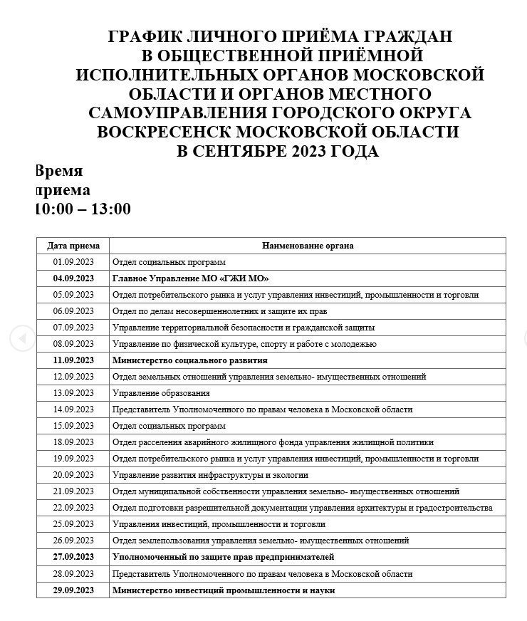 Администрация городского округа Воскресенск Московской области информирует о Графике личного приема граждан в общественной приемной исполнительных органов Московской области и органов местного самоуправления городского округа Воскресенск Московской области в сентябре 2023 года.