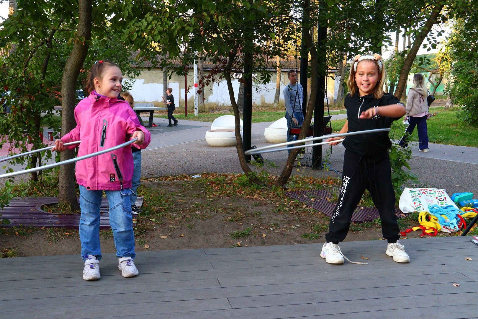 Ребята разделились на две команды и соревновались в умении красиво дефилировать по сцене, плести гигантские косы, вращать обручи, танцевать деревенские танцы и многое другое.