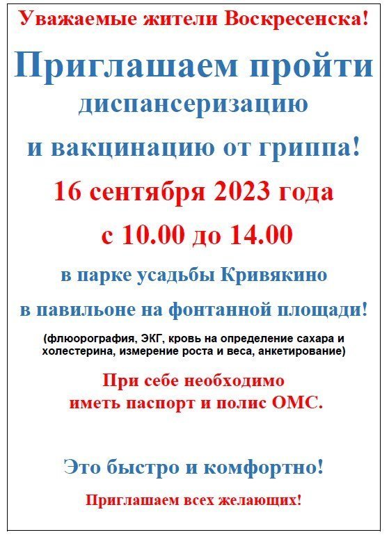Приглашаем пройти диспансеризацию и вакцинацию от гриппа 16 сентября 2023 года с 10.00 до 14.00 часов в парке усадьбы Кривякино