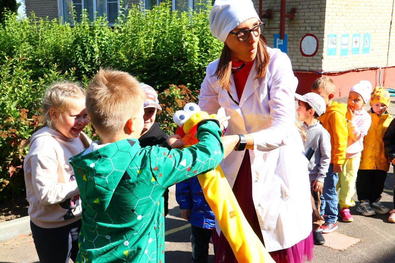 Врачи измерили детям температуру, а затем пригласили ребят в путешествие по городу «Здоровейск». Ребята побывали на улицах: «Успевай-ка», «Движение – жизнь», «Чистюлькино», «Вкуснотейкино», «Полезные и вредные», «Улица хорошего настроения». Дети узнали о том, как нужно заботиться о своем здоровье, что включает в себя понятие «здоровый образ жизни», вспомнили распорядок дня, полезное меню, правила гигиены, обсудили вредные и полезные привычки, сделали зарядку, вылечили змею витаминами и приняли участие в эстафете.