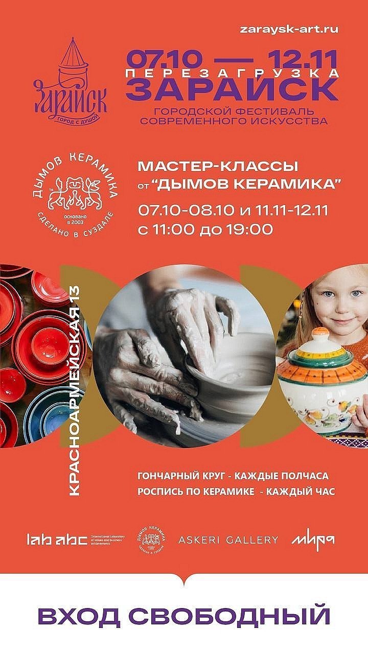 Впервые в Подмосковье будут проходить бесплатные мастер-классы по гончарному мастерству от «Дымов Керамика». Их можно посетить 7 и 8 октября с 11:00 до 19:00 каждые полчаса. У гостей также есть возможность стать участниками потрясающих уличных спектаклей. Взглянуть на город по-новому можно будет и с помощью новых арт-объектов: на домах появятся граффити, на улицах - навигация и различные малые архитектурные формы, которые неразрывно связаны с культурными кодами города – осетр, гусь, Достоевский и миры его произведений, а также бизон, который относится к признанным мировым шедеврам первобытного искусства.