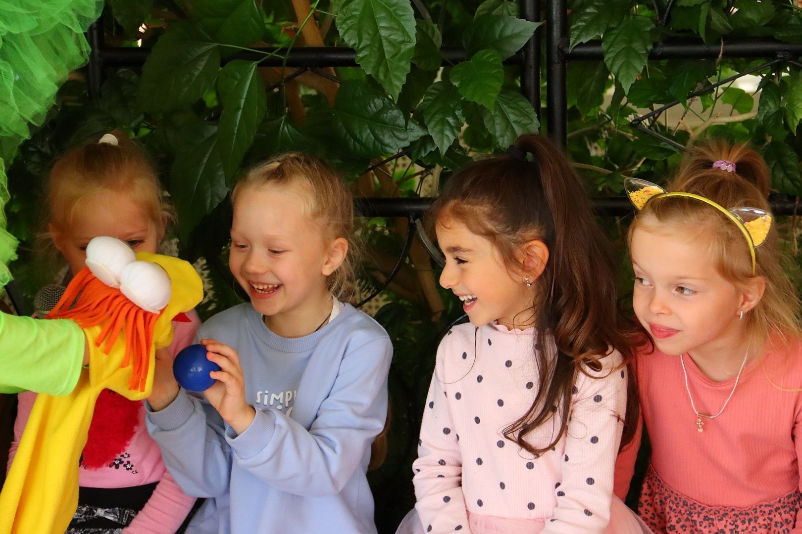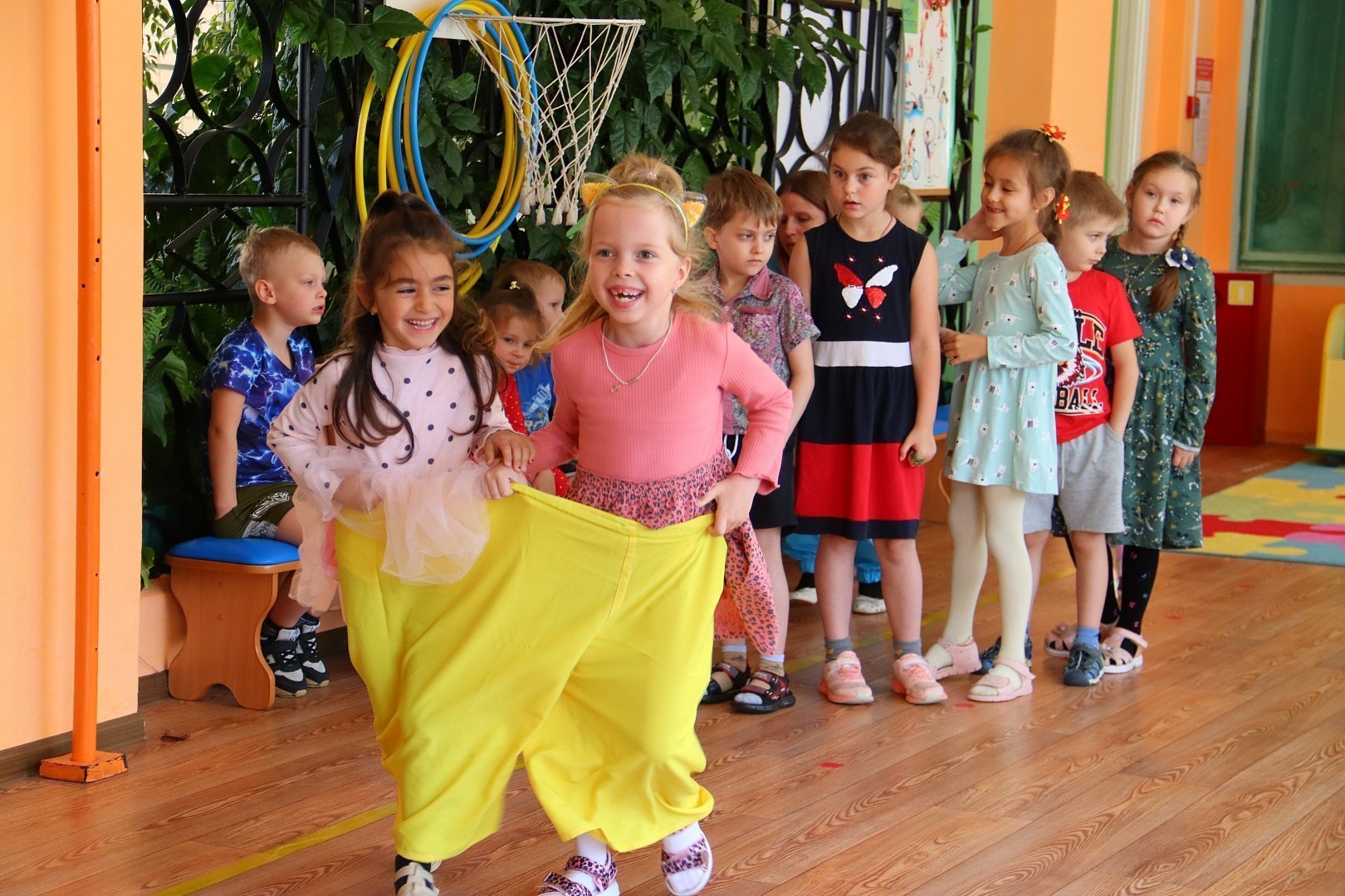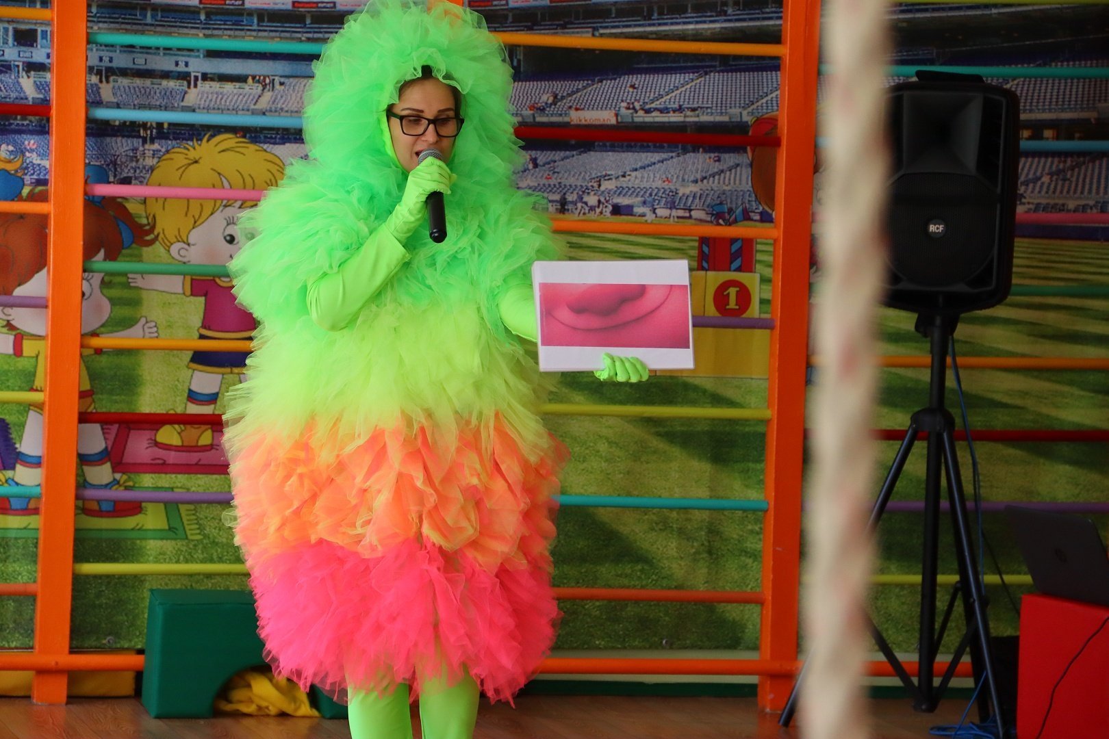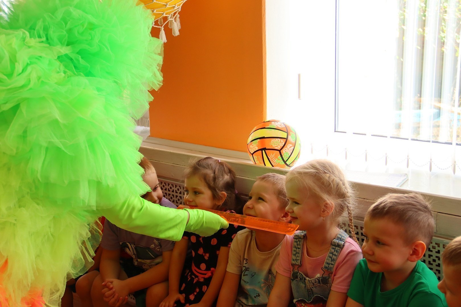 Ребята разгадывали загадки, измеряли улыбки линейкой, отвечали на шуточные вопросы, определяли, кому из известных героев мультфильмов принадлежит улыбка, бегали в необыкновенных штанах, весело танцевали и даже развеселили плачущую Змею.