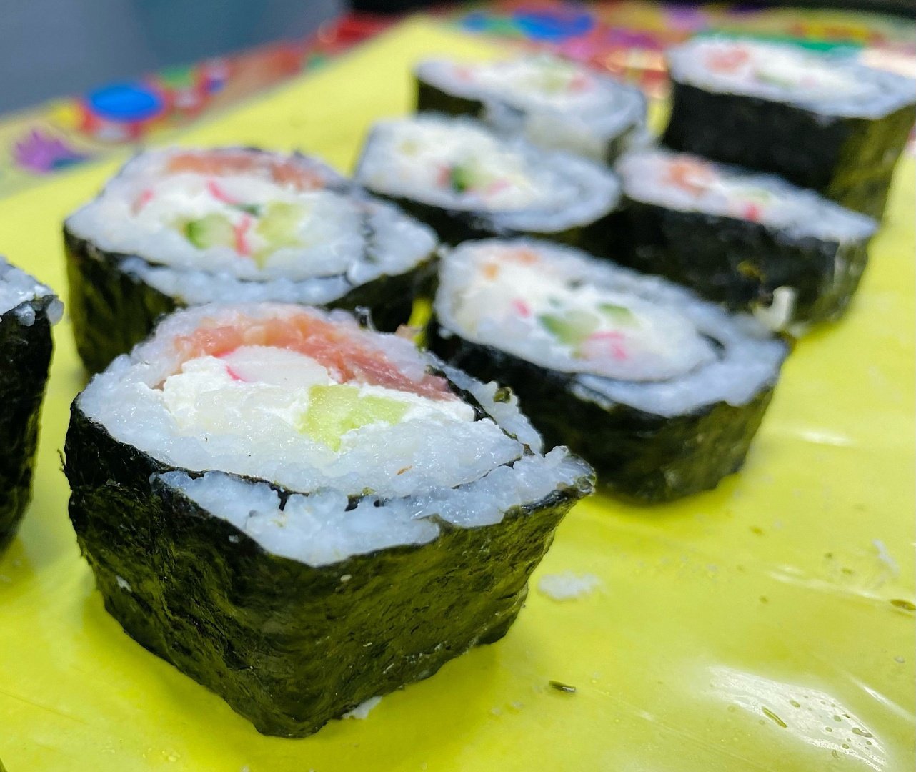Во второй половине мероприятия ребята своими руками сделали вкуснейшие роллы в подарок своим папам, самостоятельно резали огурцы и рыбу, очищали крабовые палочки, шинковали перец и с помощью специального деревянного коврика крутили роллы. Получился вкусный, оригинальный и, самое главное, сделанный своими руками, подарок.