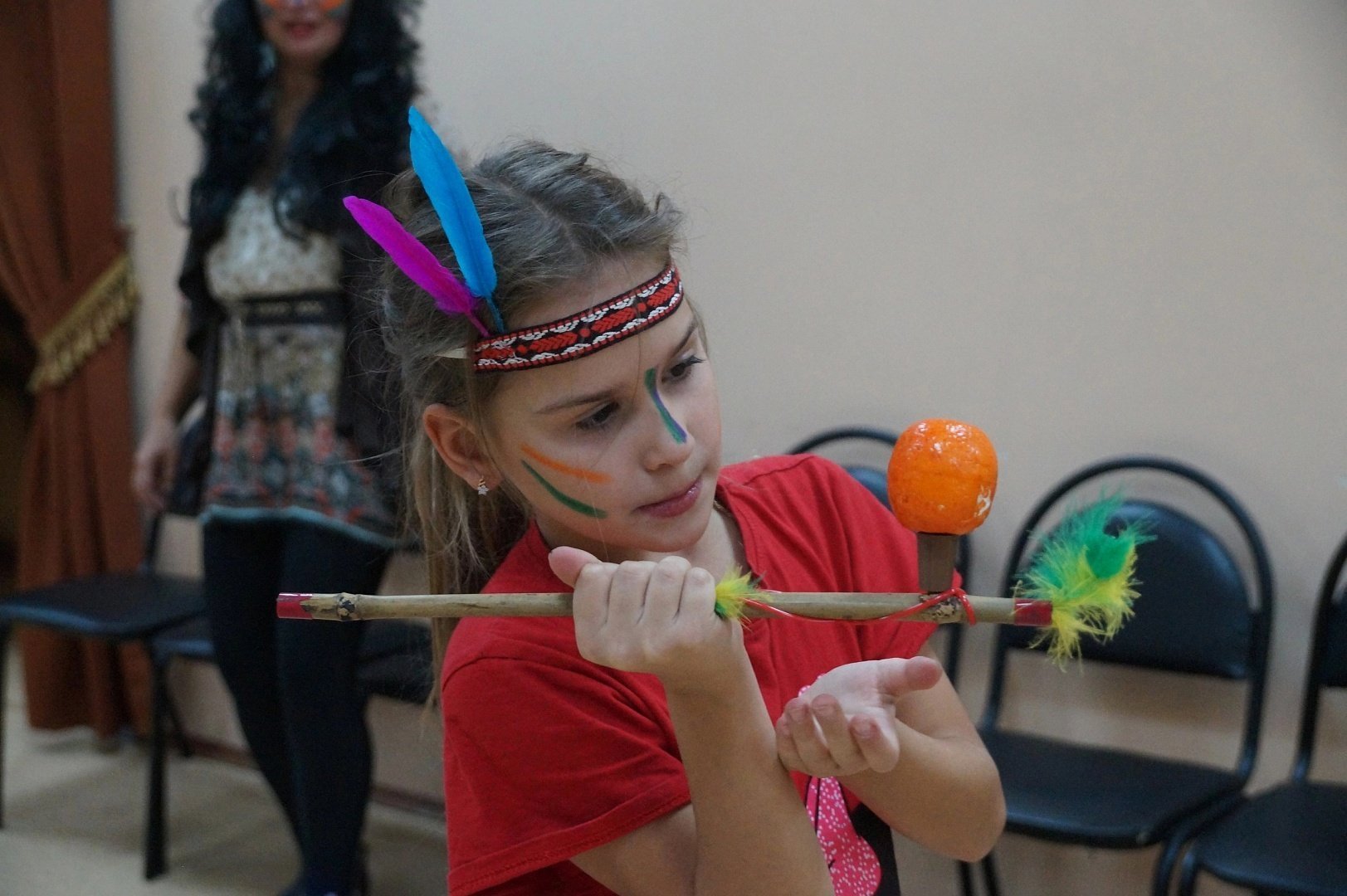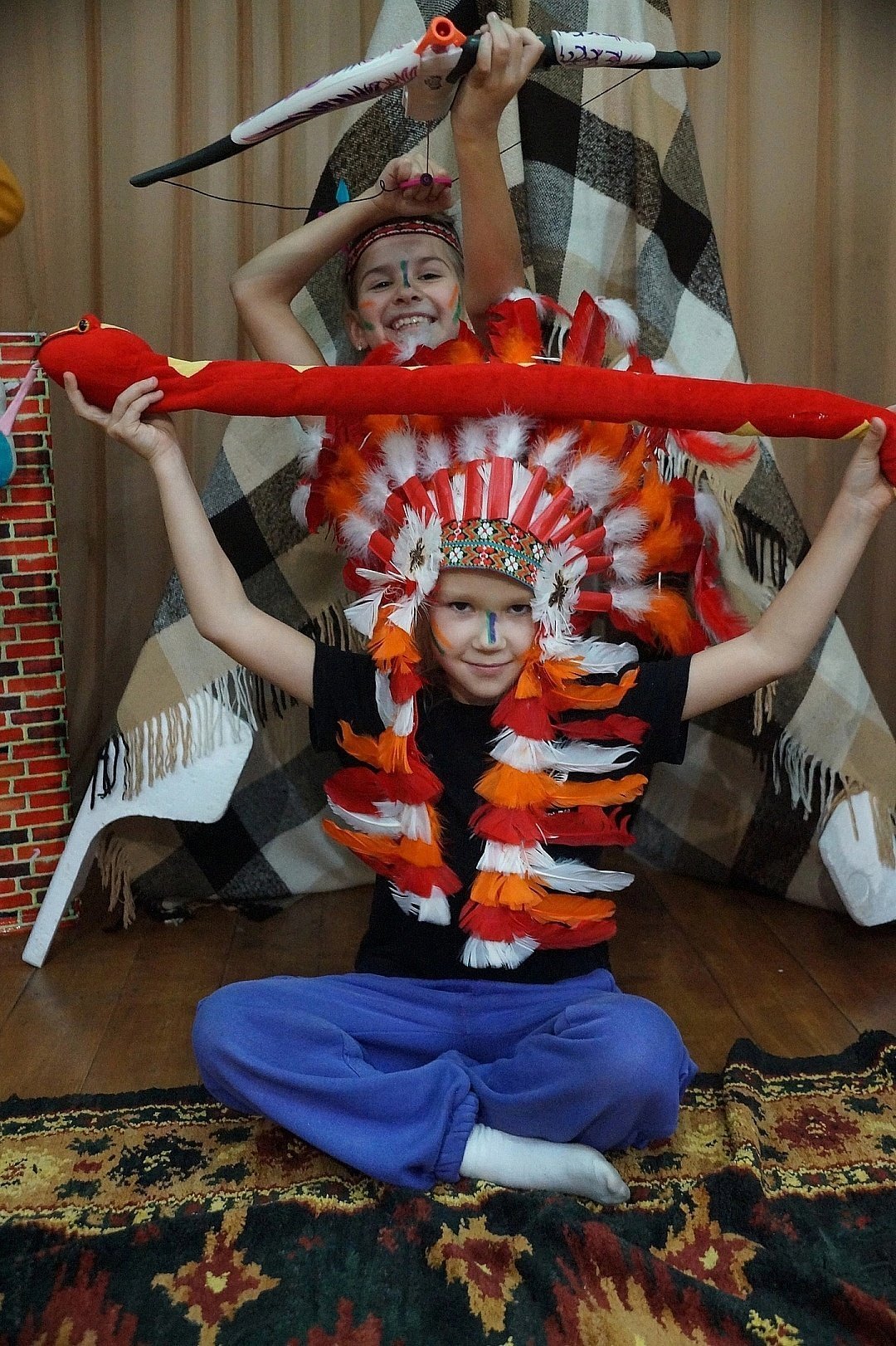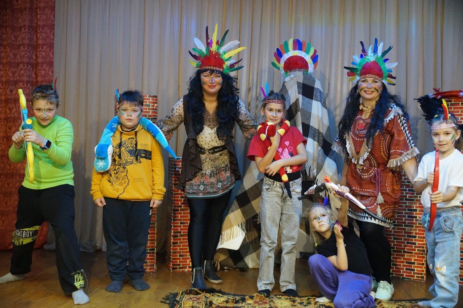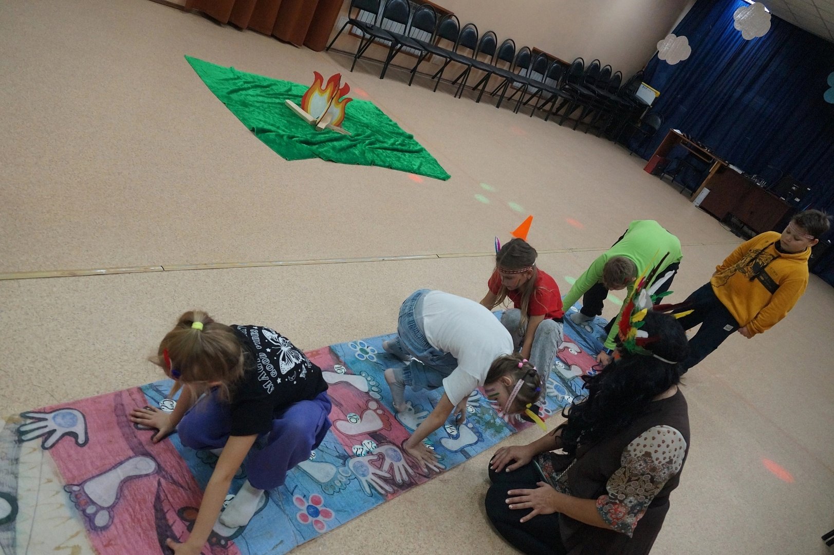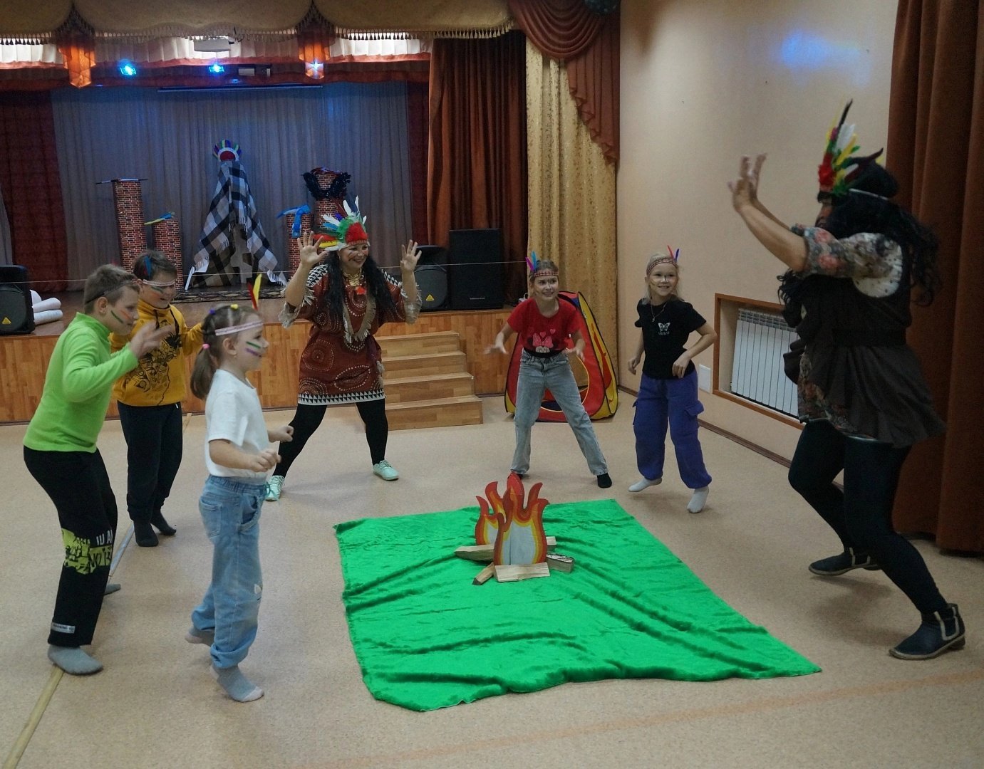 Перед началом захватывающего путешествия при помощи аквагрима и разноцветных перьев участники перевоплотились в настоящих индейцев. Исполнив «Танец радости», они приступили к выполнению заданий. Дружной сплоченной командой ребята проходили «Переправу», охотились на бизона, задабривали тотем, отгоняли злых духов от жилища и прыгали через импровизированный костёр.