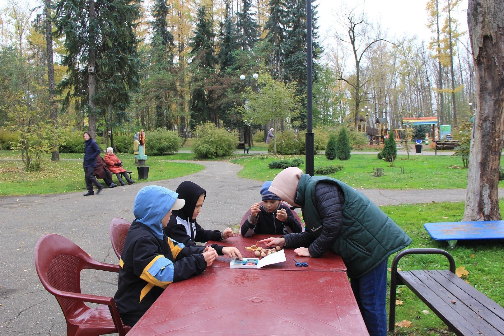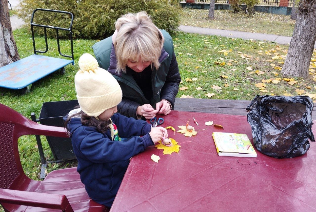 В воскресенье ребята в ходе мастер-класса слепили очаровательную улитку из пластилина и грецкого ореха. Улитка сидела на осенних листочках, которые ребята собирали в парке.