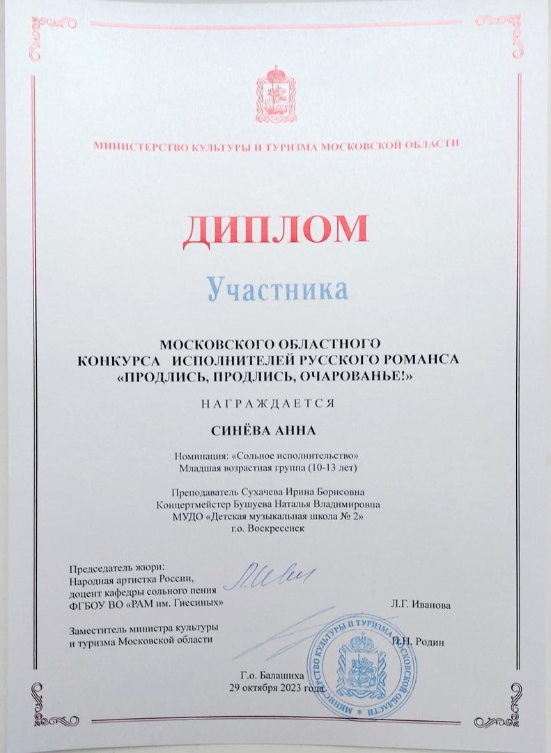 Ученики вокального отдела ДМШ №2 приняли участие в Московском областном конкурсе исполнителей русского романса "Продлись, продлись очарованье". В номинации "Сольное исполнительство" Владислав Марченко (преподаватель Е. А. Ильиных, концертмейстер О. А. Зотова) стал Лауреатом III степени, а Анна Синева( преподаватель И. Б. Сухачева, концертмейстер Н. В. Бушуева) получила диплом участника.
