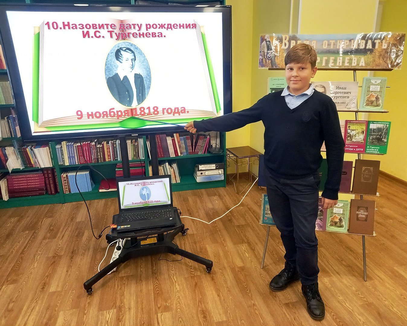 Дети познакомились с биографией и творчеством писателя. В ходе мероприятия были продемонстрированы фрагменты документальных фильмов «Тургенев. Русское сердце», «Русский мир Ивана Тургенева» и художественного фильма «Му-Му». Школьники прочитали стихотворения И.С. Тургенева, а затем разделились на две команды и ответили на вопросы викторины «Что я знаю об И.С. Тургеневе?»