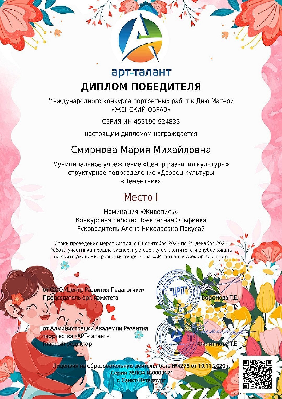 Лика Гордничева со своей работой «Весёлые зверята» заняла второе место на Международном конкурсе графического рисунка «Чёрным по белому». А «Прекрасная эльфийка» Марии Смирновой и «Женственность» Полины Бобровой выиграли первые места на Международном конкурсе портретных работ ко Дню Матери «Женский образ».
