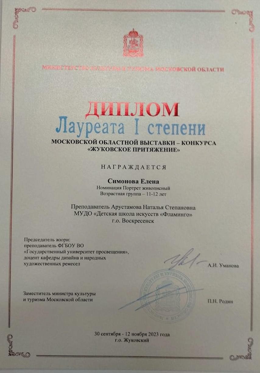 Елена Симонова- лауреат I степени в номинации "Портрет живописный" (преподаватель Арустамова Н.С.);