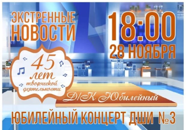 28 ноября в 18.00 в ДК "Юбилейный" состоится праздничный концерт, посвященный 45-летию Детской школы искусств №3. В концерте примут участие учащиеся, преподаватели и выпускники. В программу будут включены самые яркие и интересные события школы искусств, представлены все отделения и направления деятельности школы: оркестр и ансамбль русских народных инструментов, духовой оркестр, фольклорный ансамбль "Ирей", хоры старших и младших классов, ансамбль эстрадно-спортивного танца «Эврика», трио баянистов, солисты. Приглашаем всех желающих!