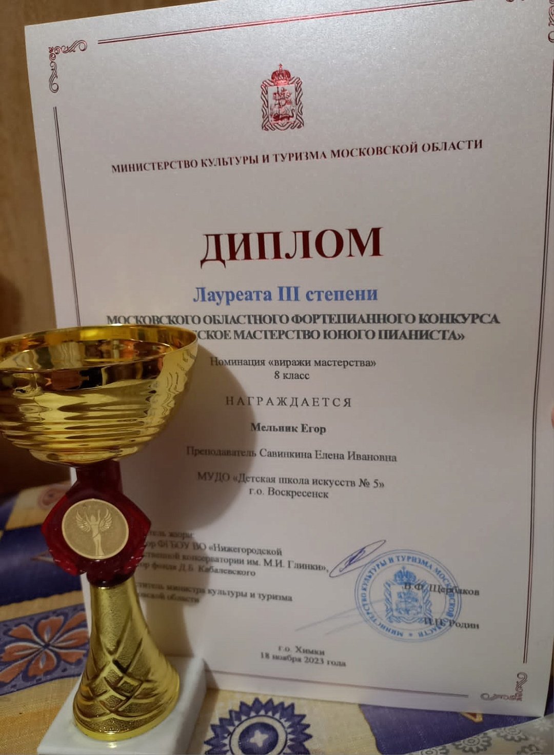 Ученик 8 класса МУДО «ДШИ №5» Егор Мельник (класс преподавателя Елены Ивановны Савинкиной) представил городской округ Воскресенск на Московском областном фортепианном конкурсе «Техническое мастерство юного пианиста». В конкурсе, который проходил в г.о. Химки, приняли участие ребята из разных уголков Москвы и Московской области.