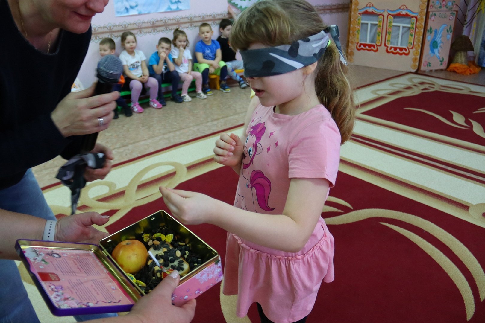 Ведущие рассказали ребятам о продуктах, которыми можно покормить пернатых друзей и белочек. Весёлые игры и конкурсы помогли детям вспомнить названия зимующих птиц и как они выглядят, отгадать птиц по голосу. Интересный конкурс «Угадай корм с закрытыми глазами» помог мальчишкам и девчонкам с помощью пальцев с закрытыми глазами определить какой корм можно давать птичкам и белочкам.