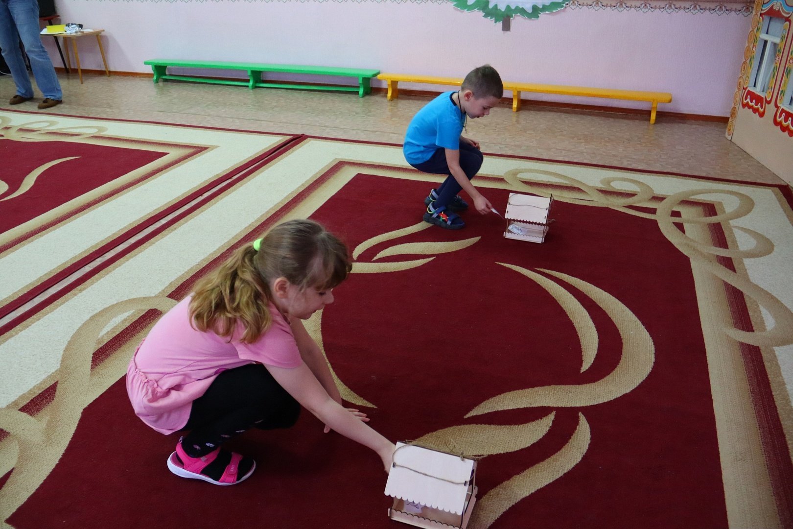 Отгадывая загадки, ребята нашли кормушки, спрятанные в зале, и участвуя в эстафете «Птички на кормушке», поместили птичек в их «зимнюю столовую».