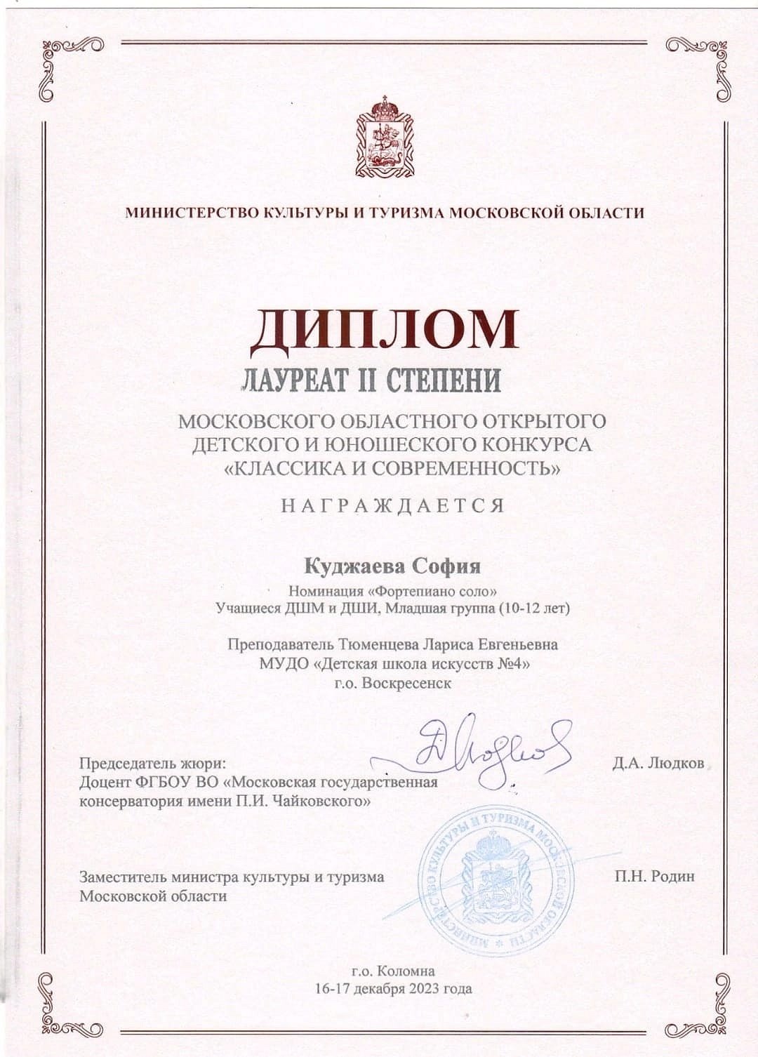София Куджаева (преподаватель Лариса Тюменцева) стала Лауреатом ll степени в номинации "Фортепиано соло"