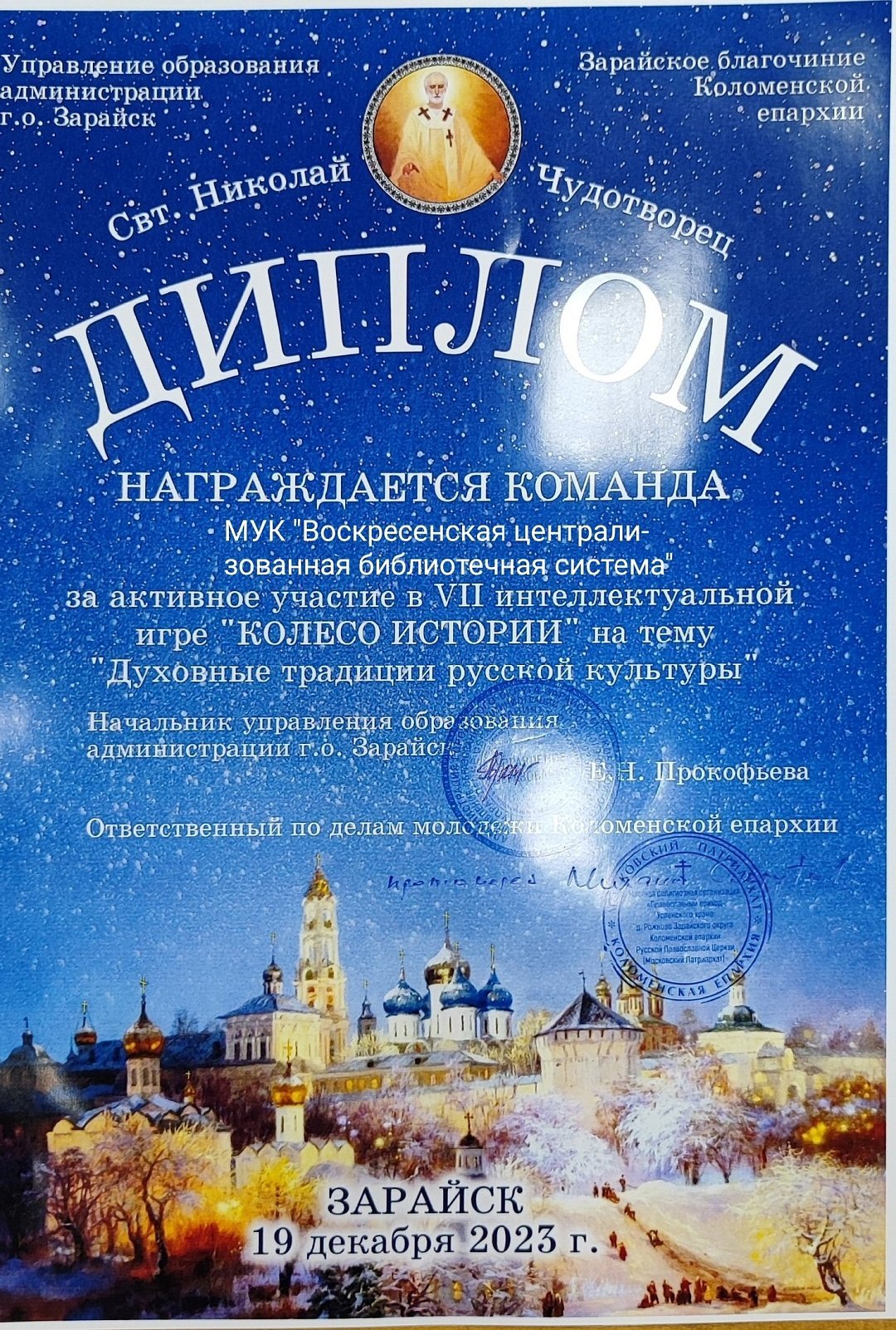 Сотрудники МУК "ВЦБС" приняли участие в VII интеллектуальной игре «Колесо истории-2023», которая проходила в городском округе Зарайск. Игра «Духовные традиции русской культуры» направлена на духовно-нравственное воспитание учащихся образовательных учреждений, на выявление наиболее подготовленных команд по знанию основных культурных традиций России: живописи, музыки, литературы, народной культуры.
