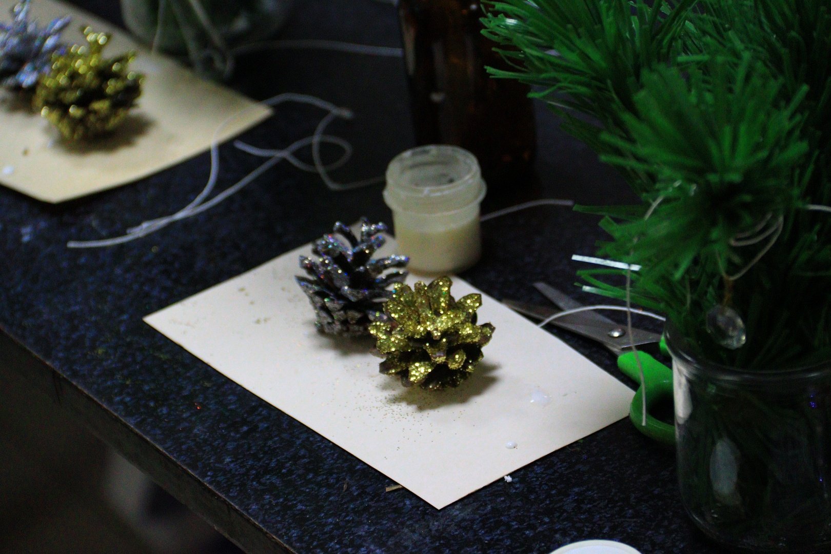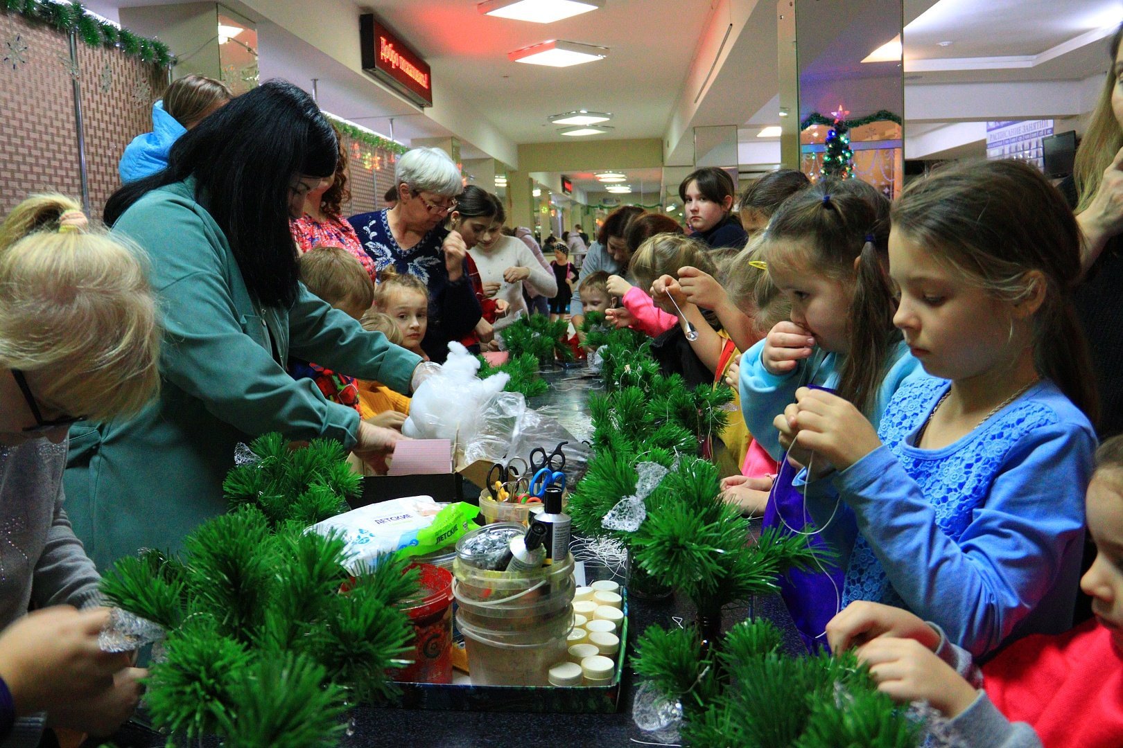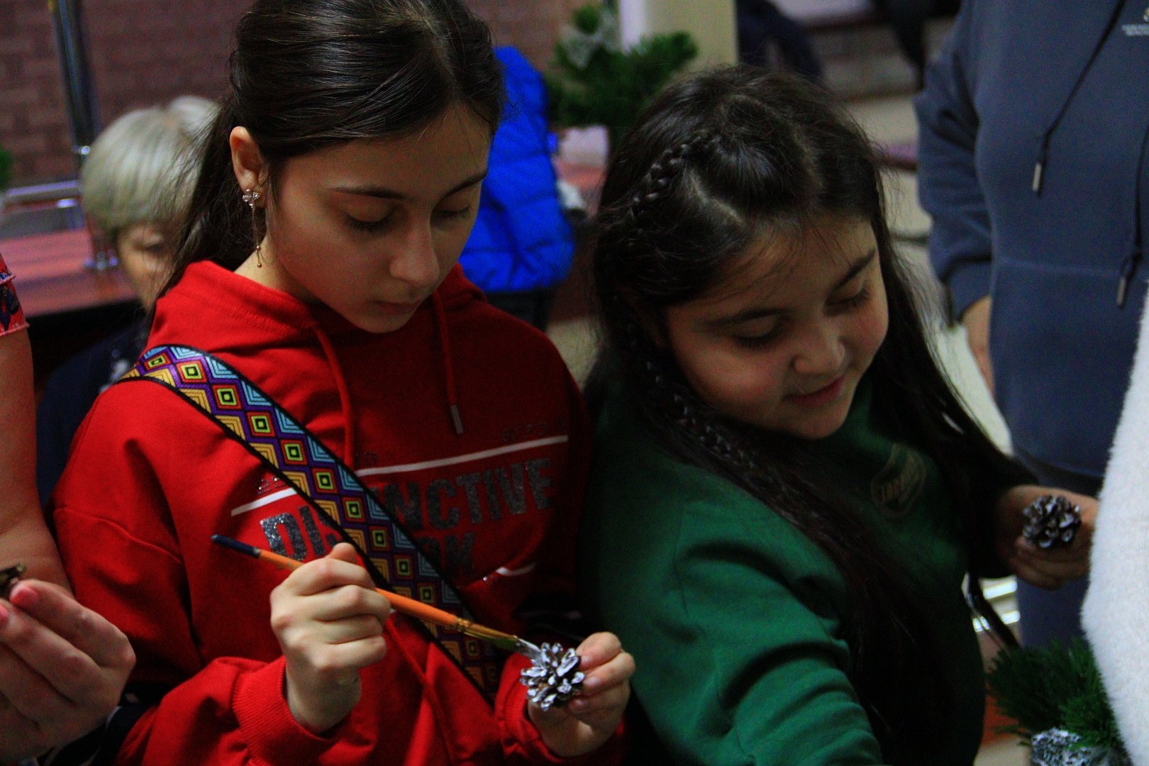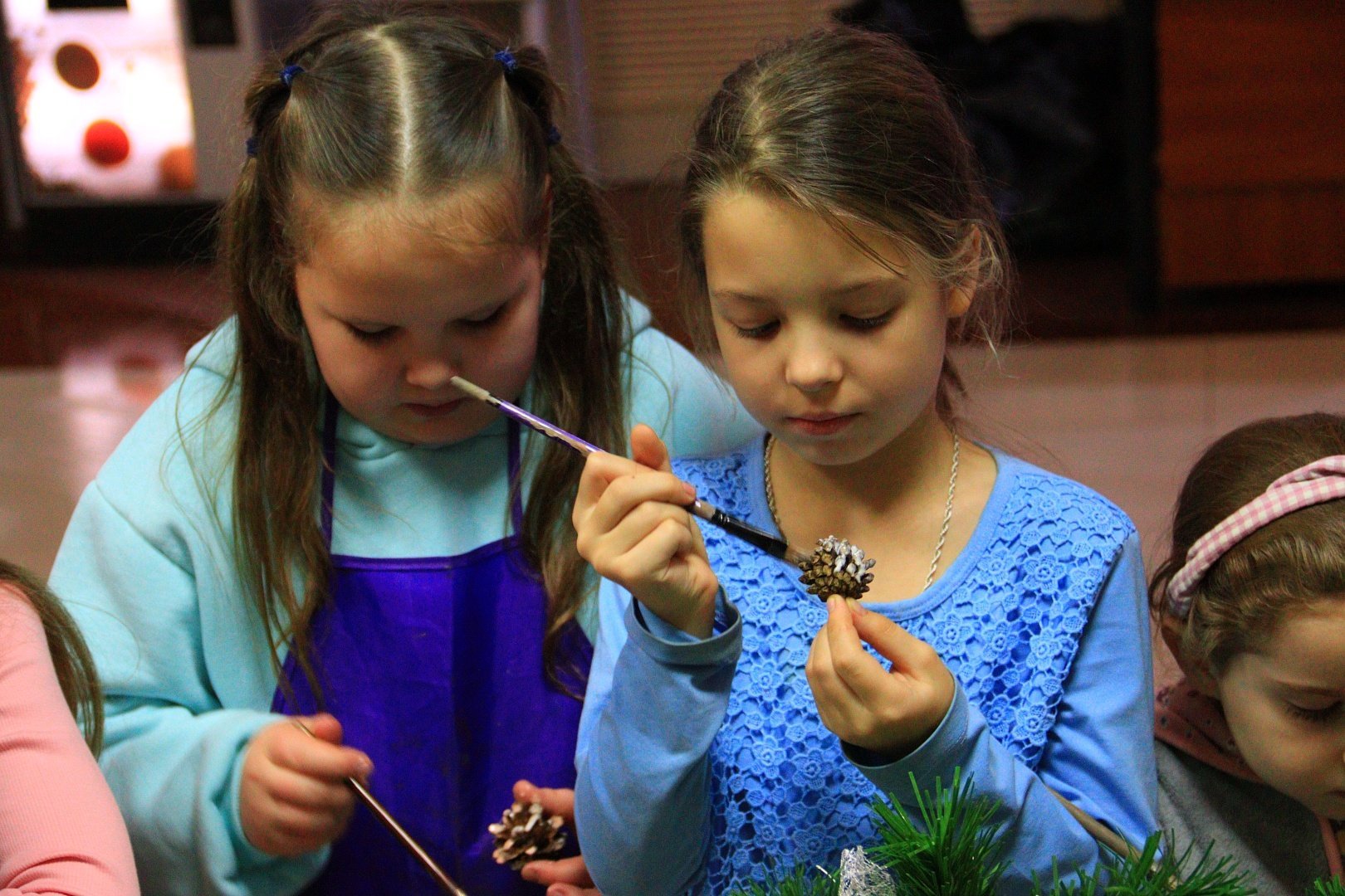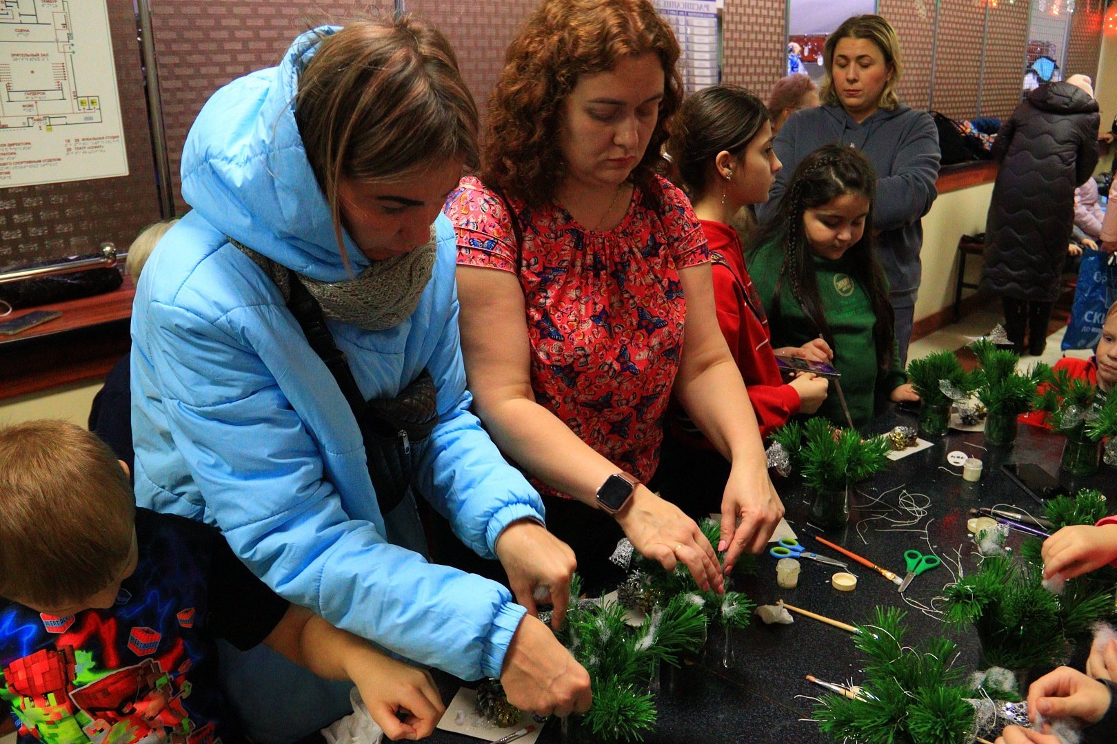 Под руководством ведущей мастер-класса все присутствующие гости дворца, дети и их родители, с удовольствием приняли участие в оформлении праздничного букета из еловых веток. Новогодний букет участники мастер-класса украшали золотыми и серебряными шишками, красивыми бантами, стеклянными подвесками и зеркальными пластинками.