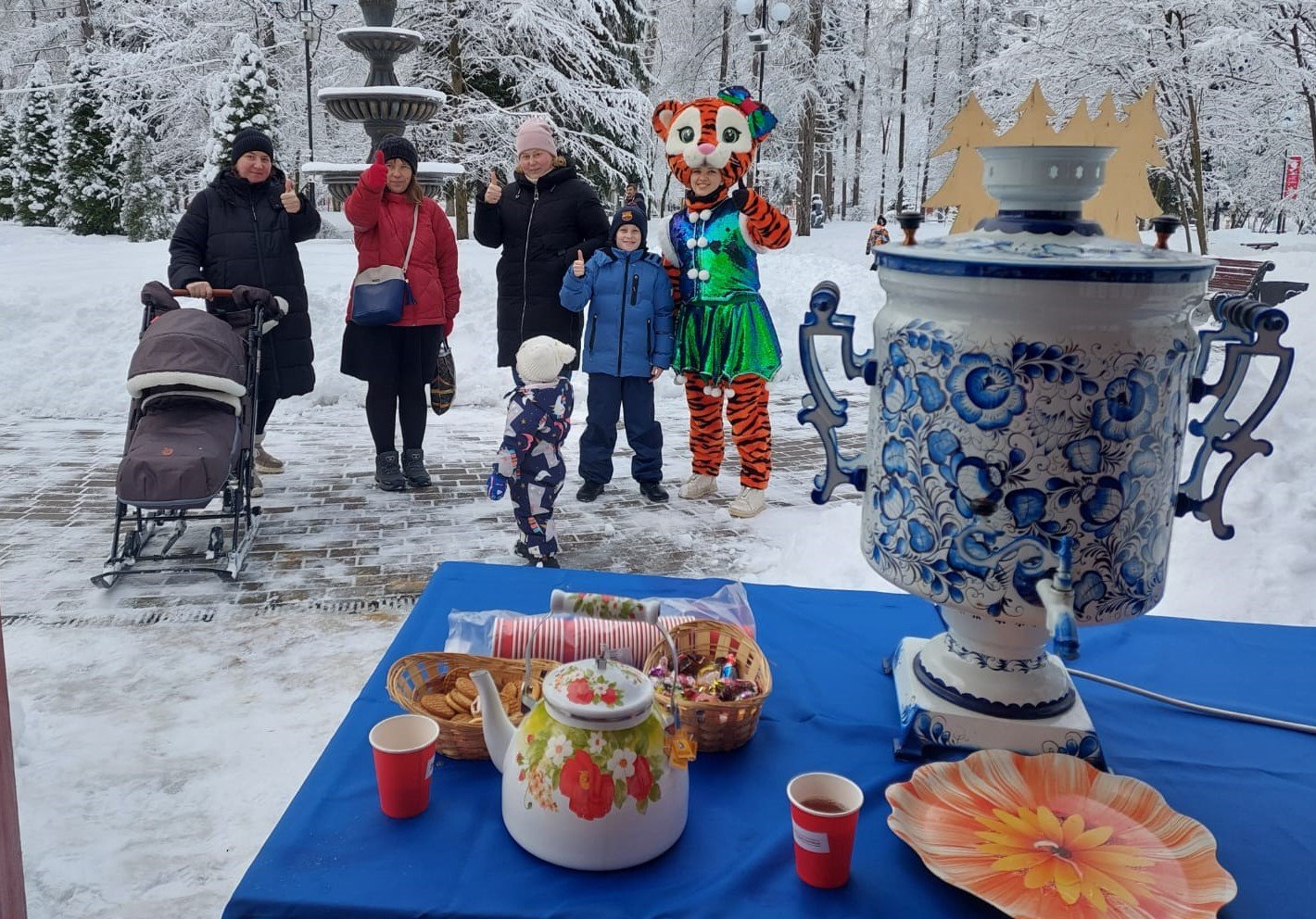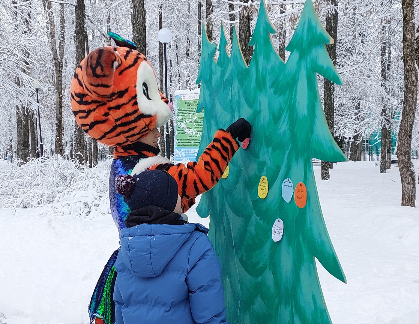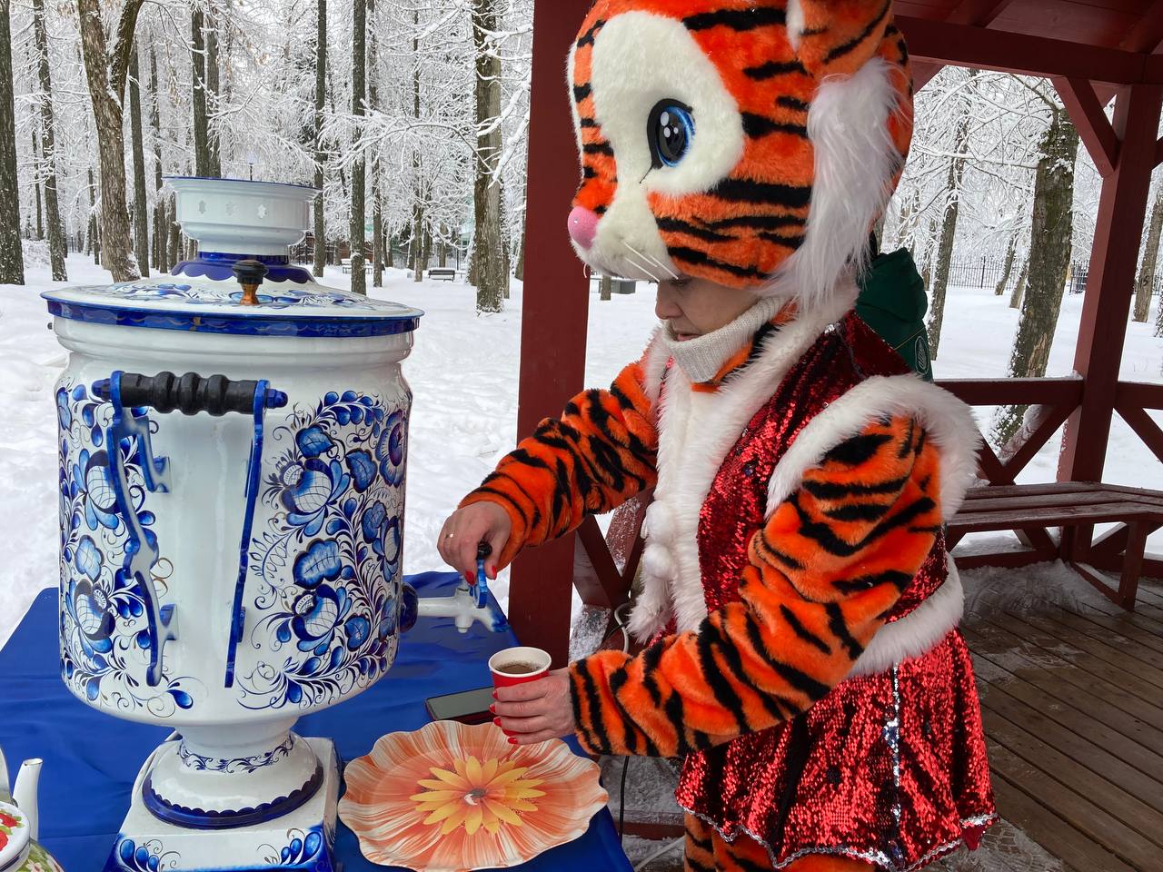 Гости парка смогли оставить новогодние пожелания на бумажных ёлочных игрушках, прикрепив их к доске пожеланий в виде ёлочки. Мероприятие завершилось праздничным чаепитием. Горячий ароматный чай прямо из самовара и вкусные угощения очень порадовали не только малышей, но и взрослых.