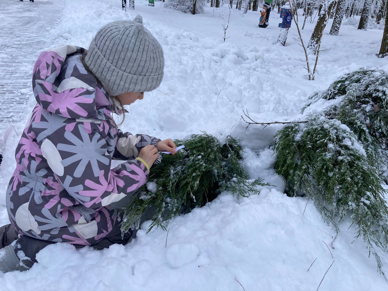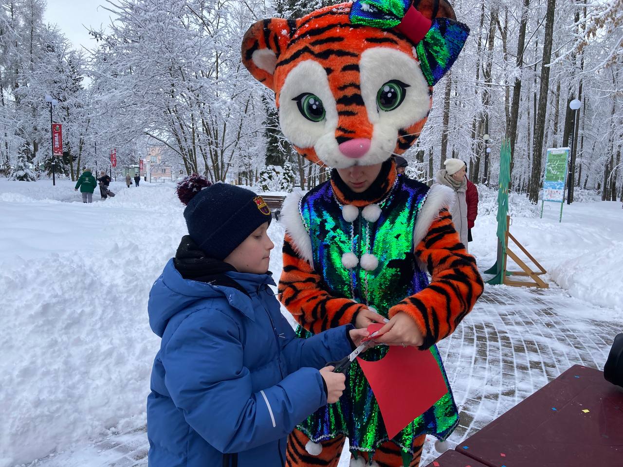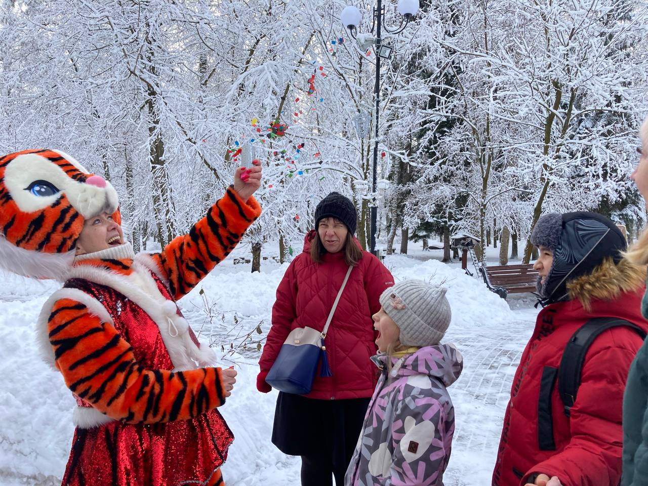 Гости парка смогли оставить новогодние пожелания на бумажных ёлочных игрушках, прикрепив их к доске пожеланий в виде ёлочки. Мероприятие завершилось праздничным чаепитием. Горячий ароматный чай прямо из самовара и вкусные угощения очень порадовали не только малышей, но и взрослых.