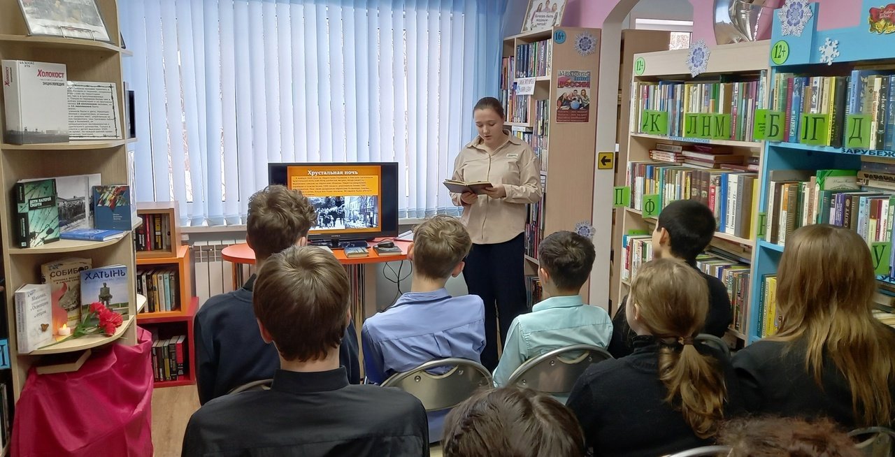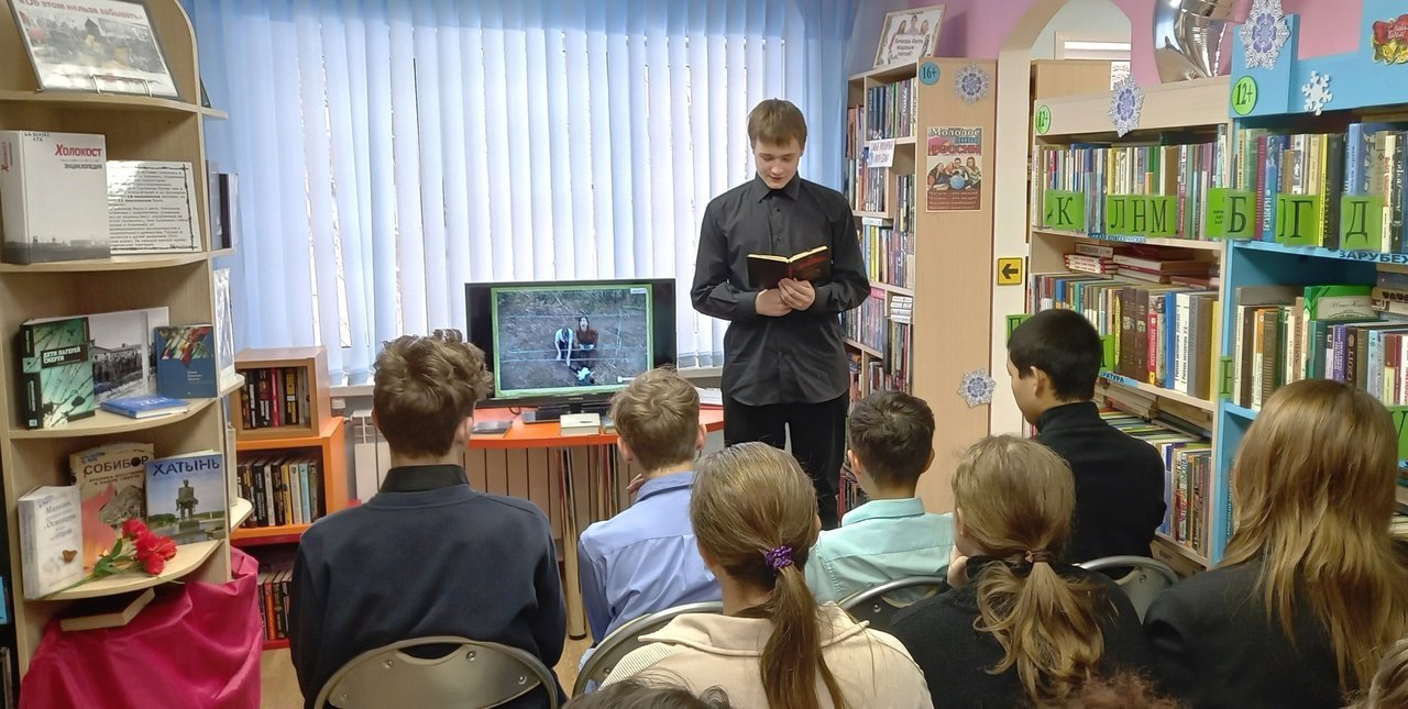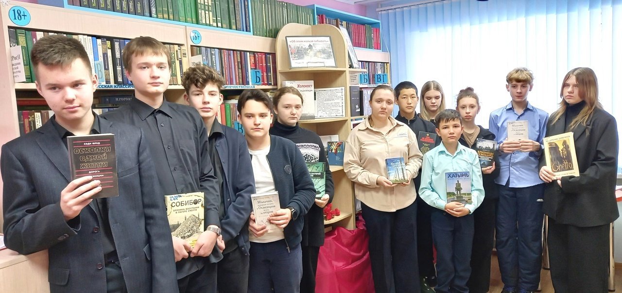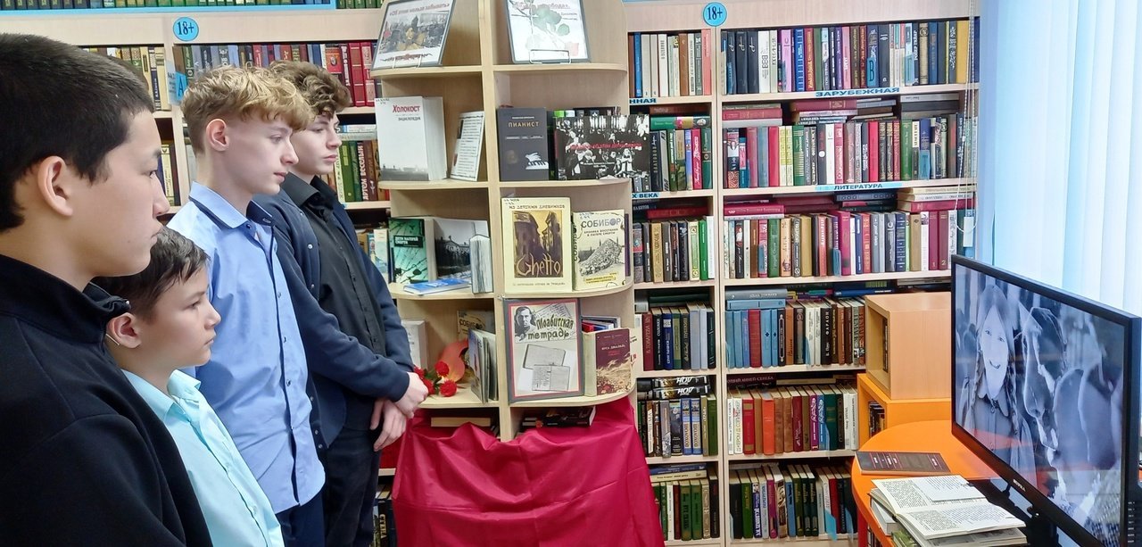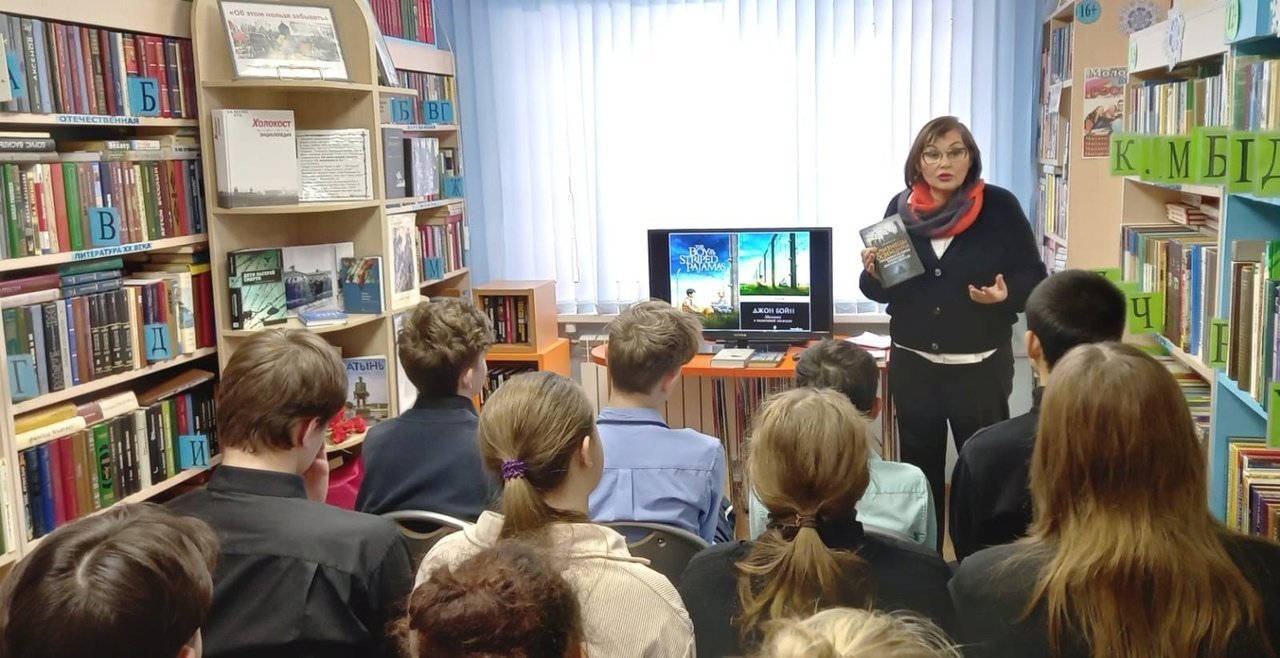 В ходе знакомства с книжной экспозицией, посвященной этой теме, большой интерес у школьников вызвал роман ирландского писателя Джона Бойна «Мальчик в полосатой пижаме». После просмотра слайд-фильма они обсуждали сюжет книги, выражая свое отношение к главной мысли.