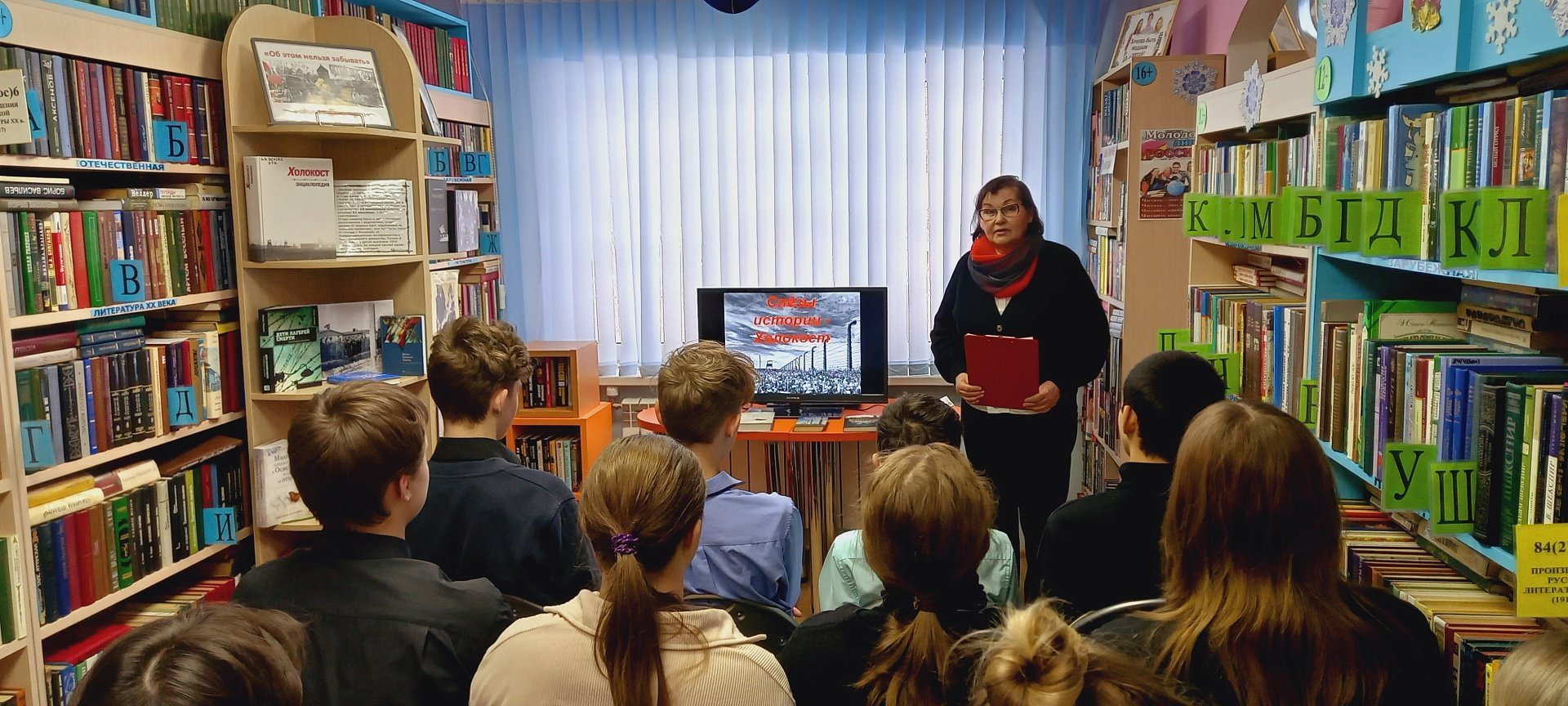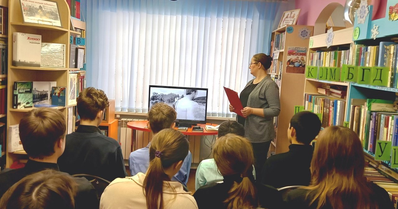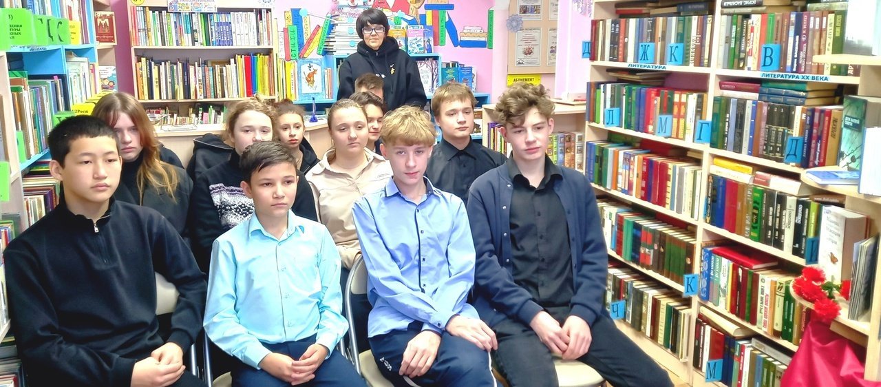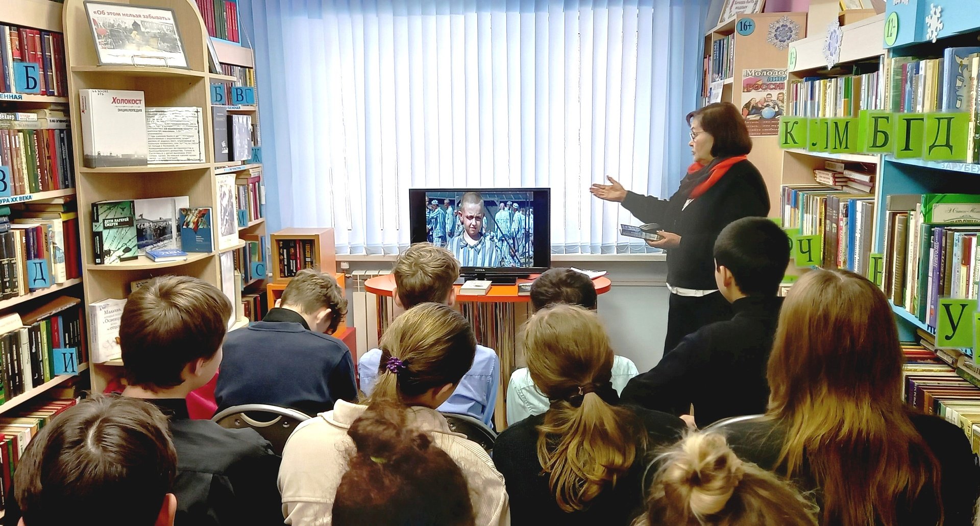 В ходе знакомства с книжной экспозицией, посвященной этой теме, большой интерес у школьников вызвал роман ирландского писателя Джона Бойна «Мальчик в полосатой пижаме». После просмотра слайд-фильма они обсуждали сюжет книги, выражая свое отношение к главной мысли.