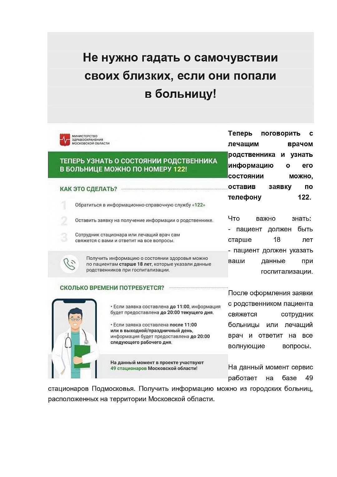 Теперь поговорить с лечащим врачом родственника, попавшего в больницу и узнать информацию о его состоянии можно, оставив заявку по телефону 122. Подробности - в инфографике.
